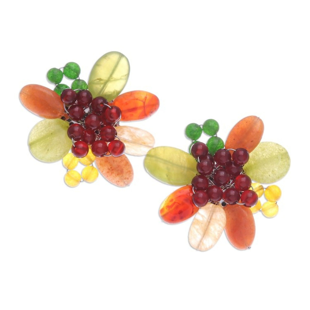 Red and Green Floral Quartz and Serpentine Clip-On Earrings 'Summer Petals'