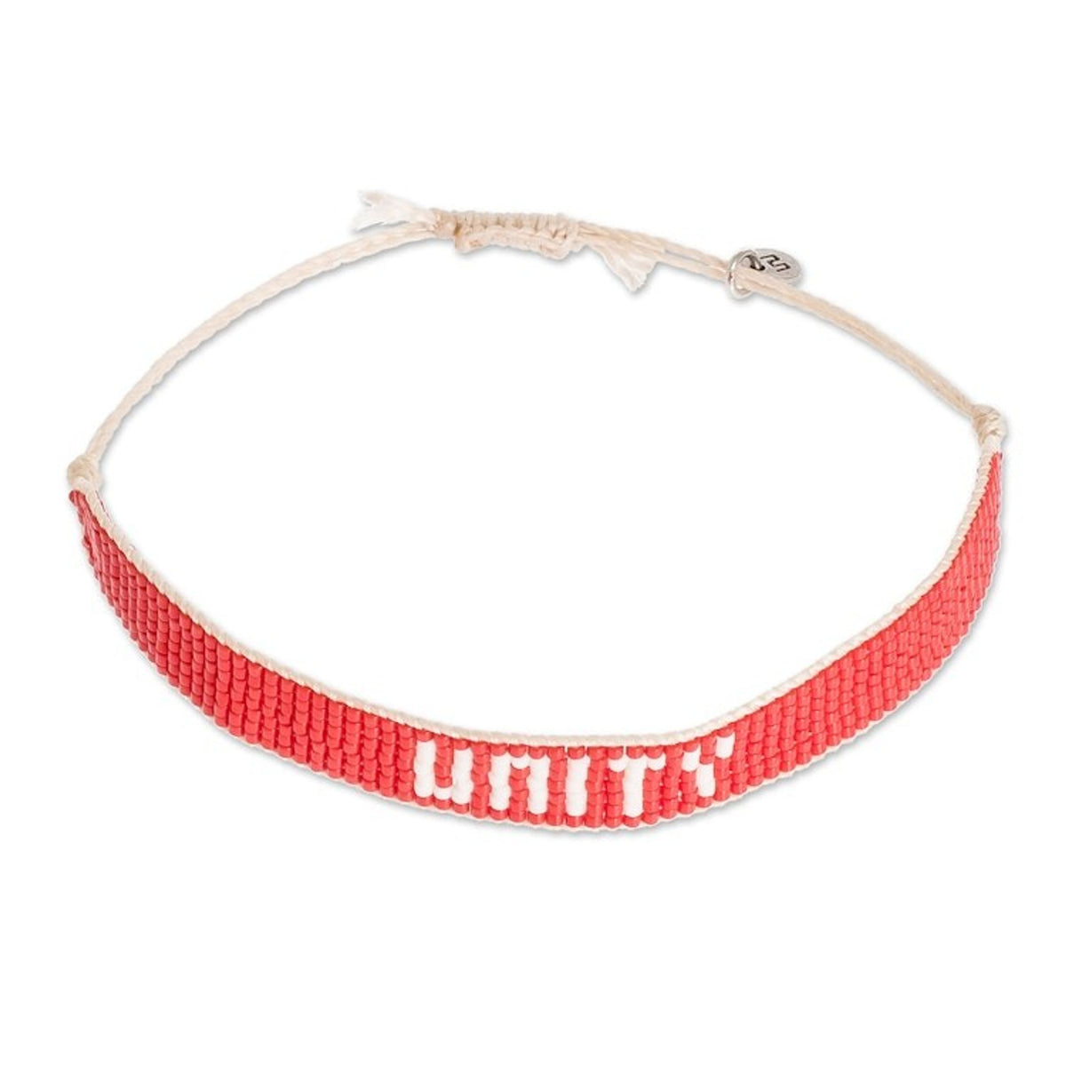 Red and White Glass Beaded Woven Bracelet with Sliding Knot 'Unity in Red'