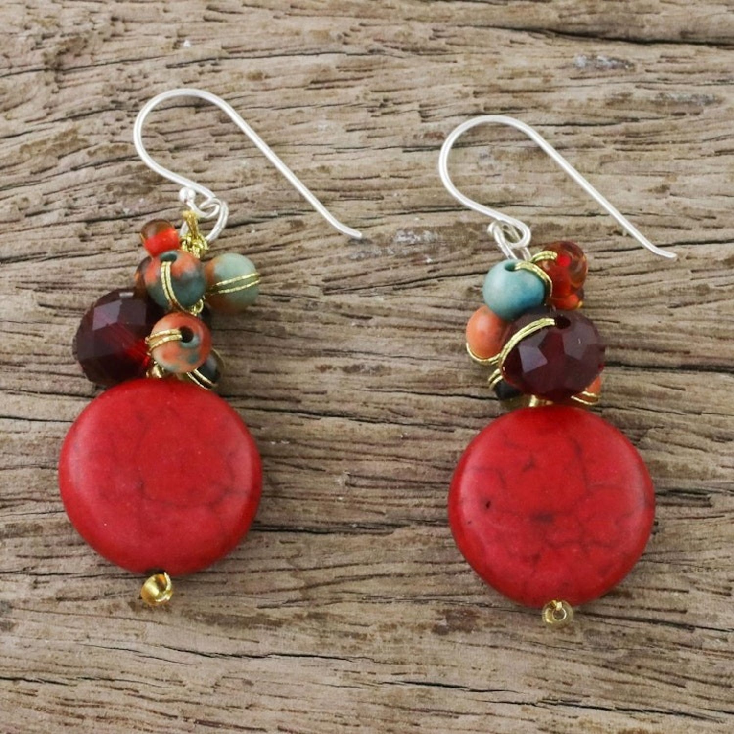 These Red Calcite and Glass Bead Dangle Earrings from Thailand 'Red Circles' by Independent Artisans are a bold and wonderful pair of earrings from Thai artisan Nareerat. They feature polished, bold circles of red calcite that dangle from clusters of colorful glass beads. The high-polish finish enhances the vibrancy of the red calcite, while the sterling silver hooks ensure comfortable wear. These earrings are a celebration of nature, color, and community empowerment.