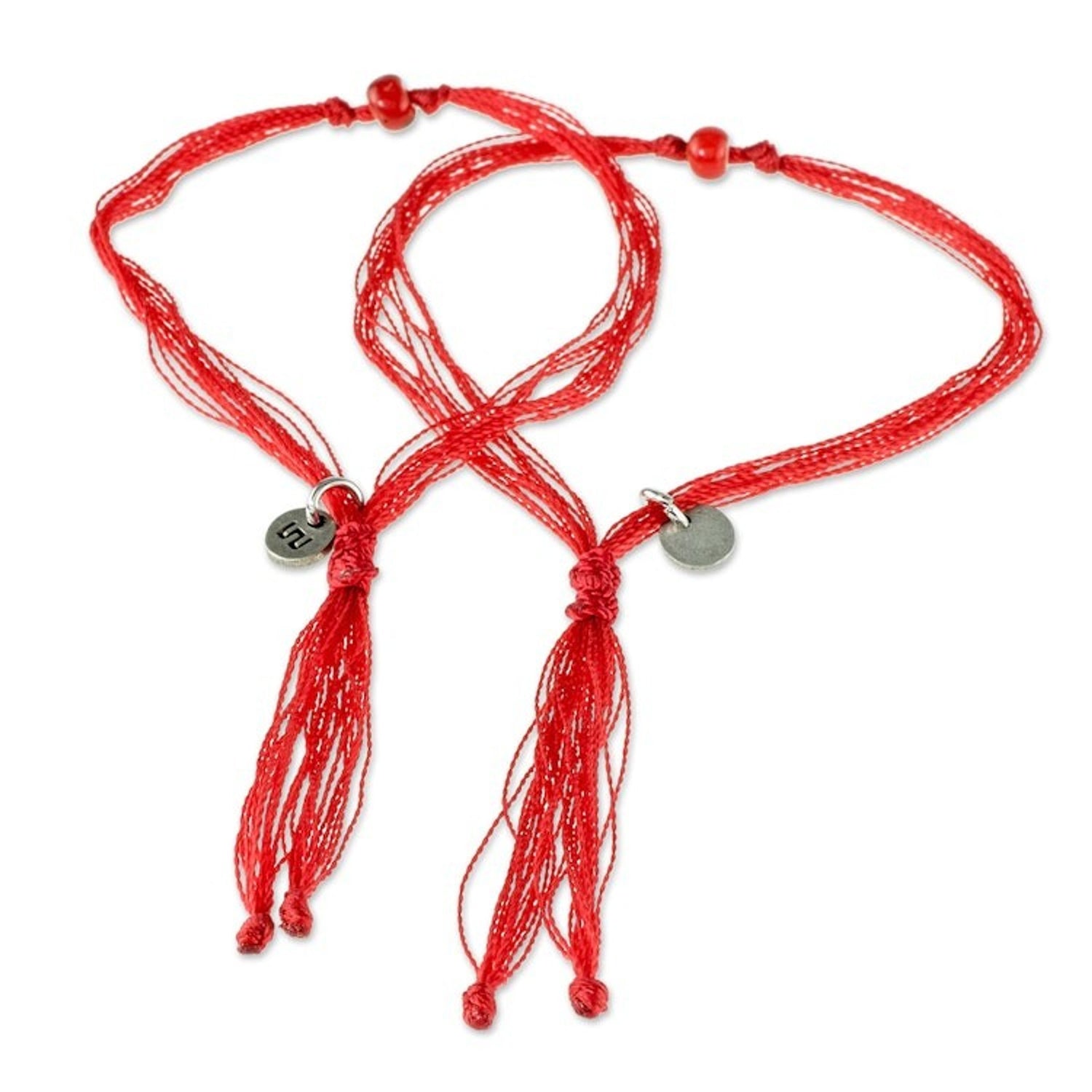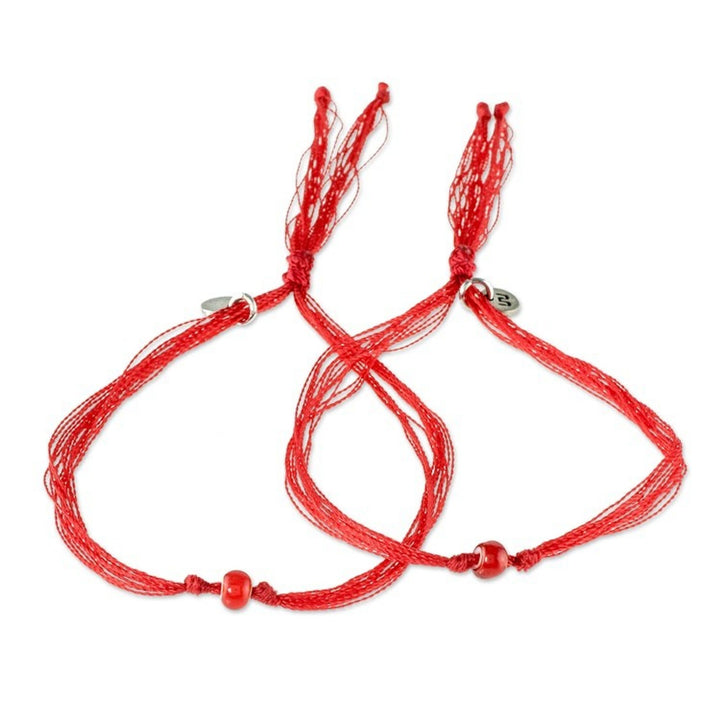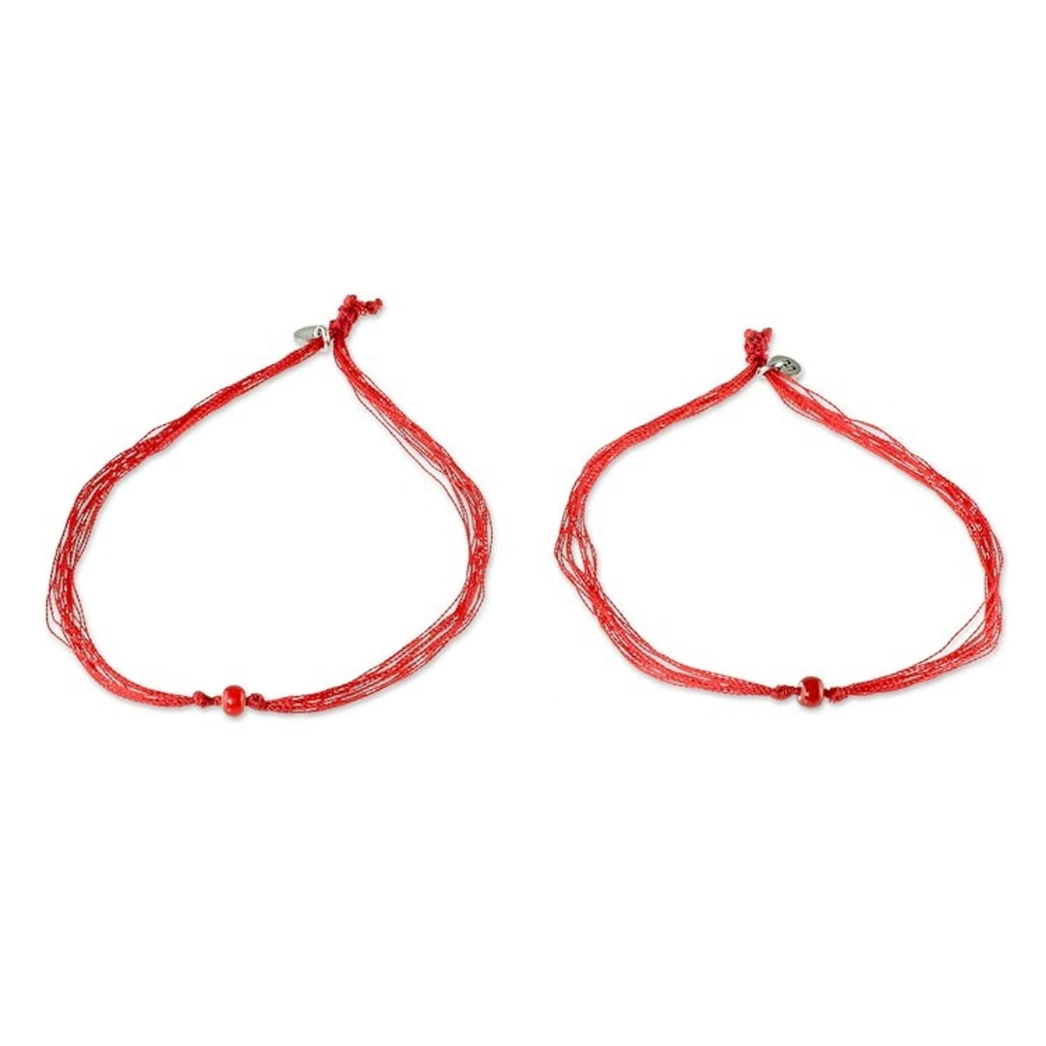 This Red Cord Bracelets with Red Glass Beads Pair 'For You and Me' by Independent Artisans is a fun pair of bracelets designed to be shared with a special friend. Crafted by Wakami artisans in Guatemala, they are made of bright red waxed polyester cords and are centered with red glass beads. A sliding knot allows the length to be adjusted, making them perfect for any wrist size. The bracelets are a symbol of dreams, hope, and unity, and they help to connect rural artisans with global markets.