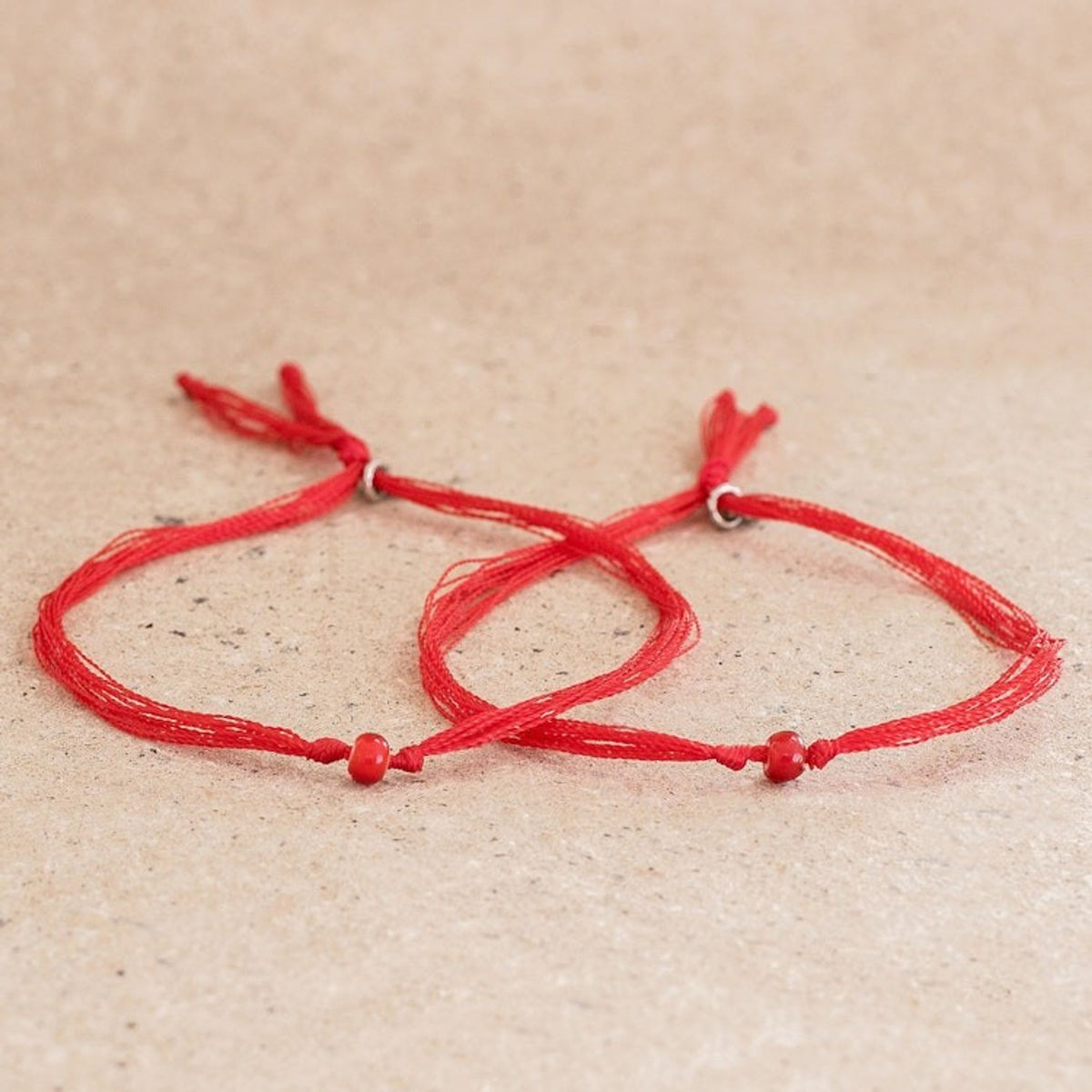 Red Cord Bracelets with Red Glass Beads Pair 'For You and Me'