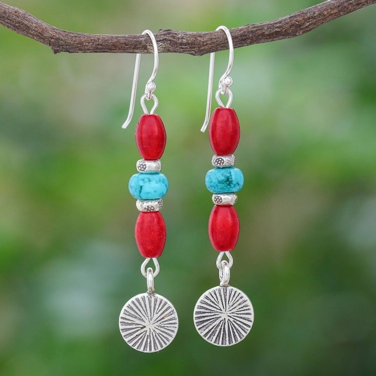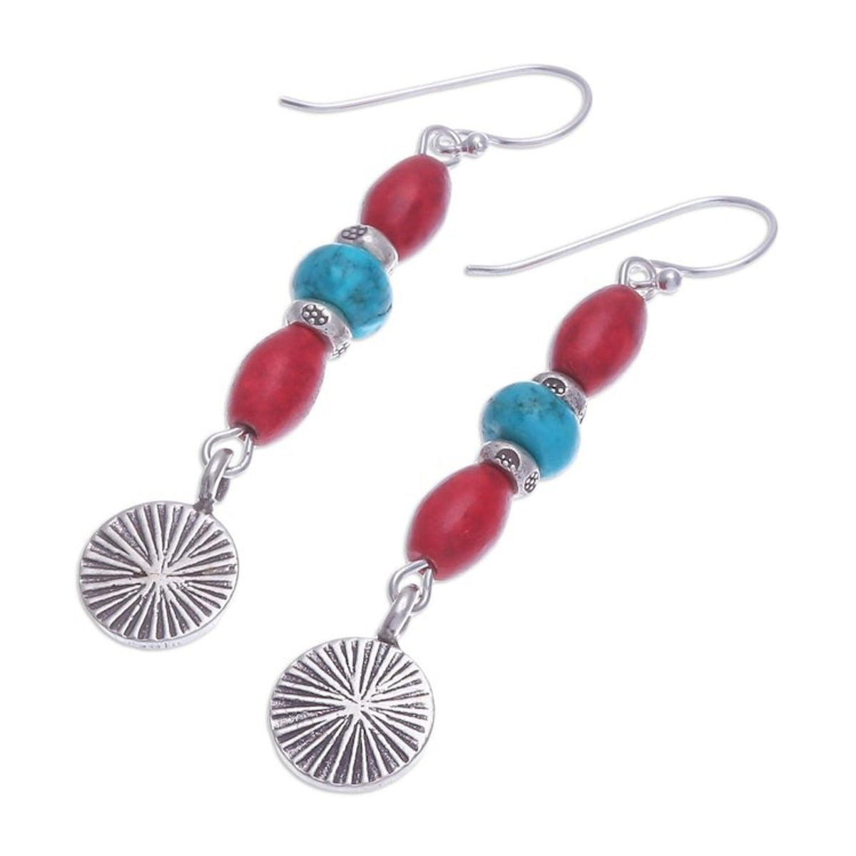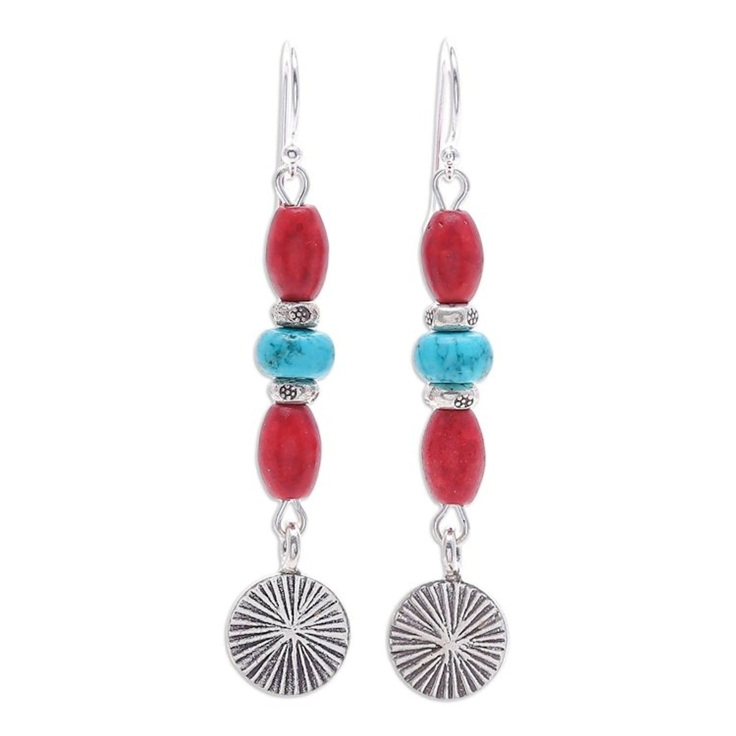These Red Howlite and Karen Silver Dangle Earrings 'Beach Getaway' by Independent Artisans are head-turning earrings that are perfect for a breezy getaway. Designed by Tipa from Thailand, they are made with 950 Karen silver, which is engraved with a radial motif. The earrings also feature bright beads of dyed howlite and reconstituted turquoise that add an irresistible color combination. The sterling silver hooks provide the finishing touch, making these earrings an elegant and versatile accessory.
