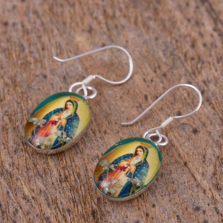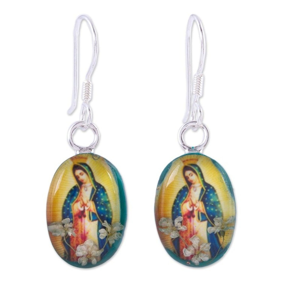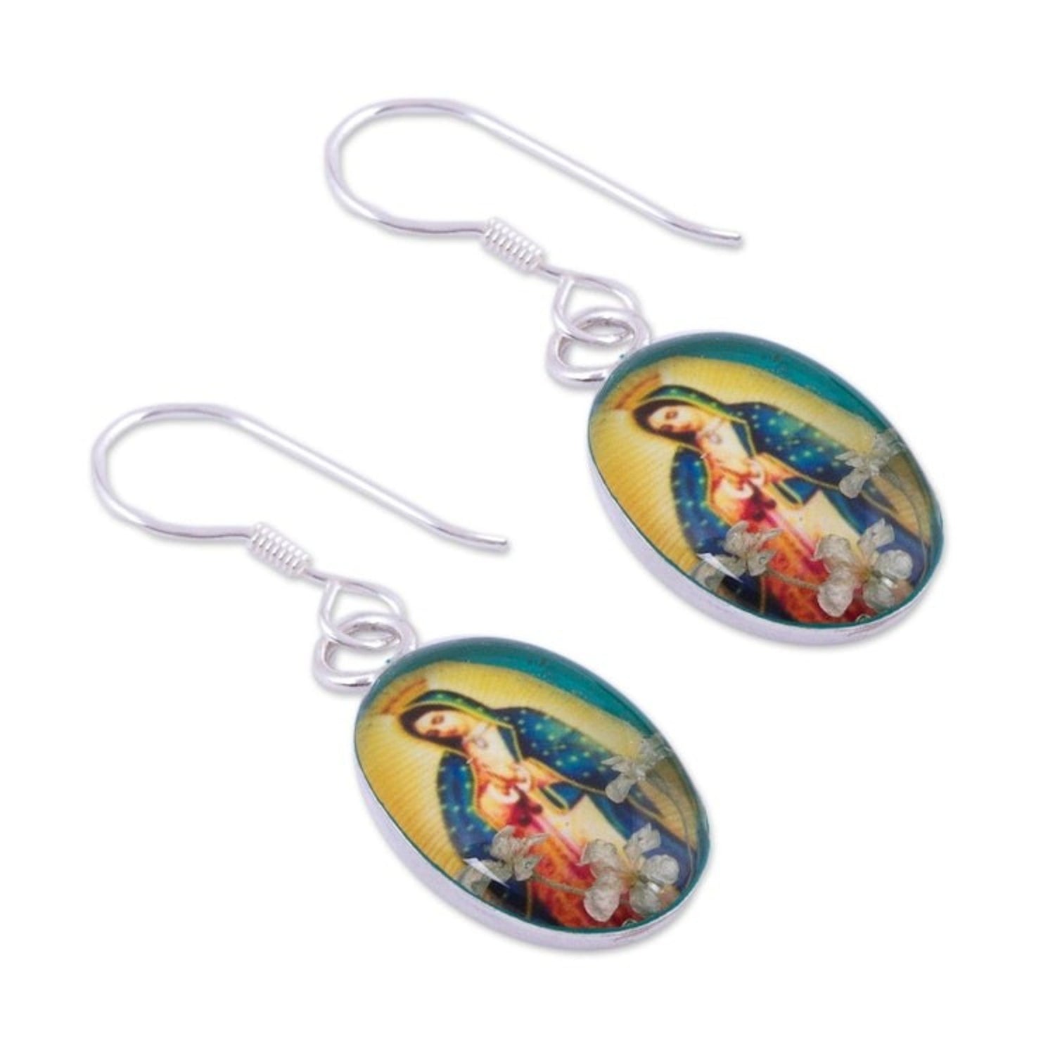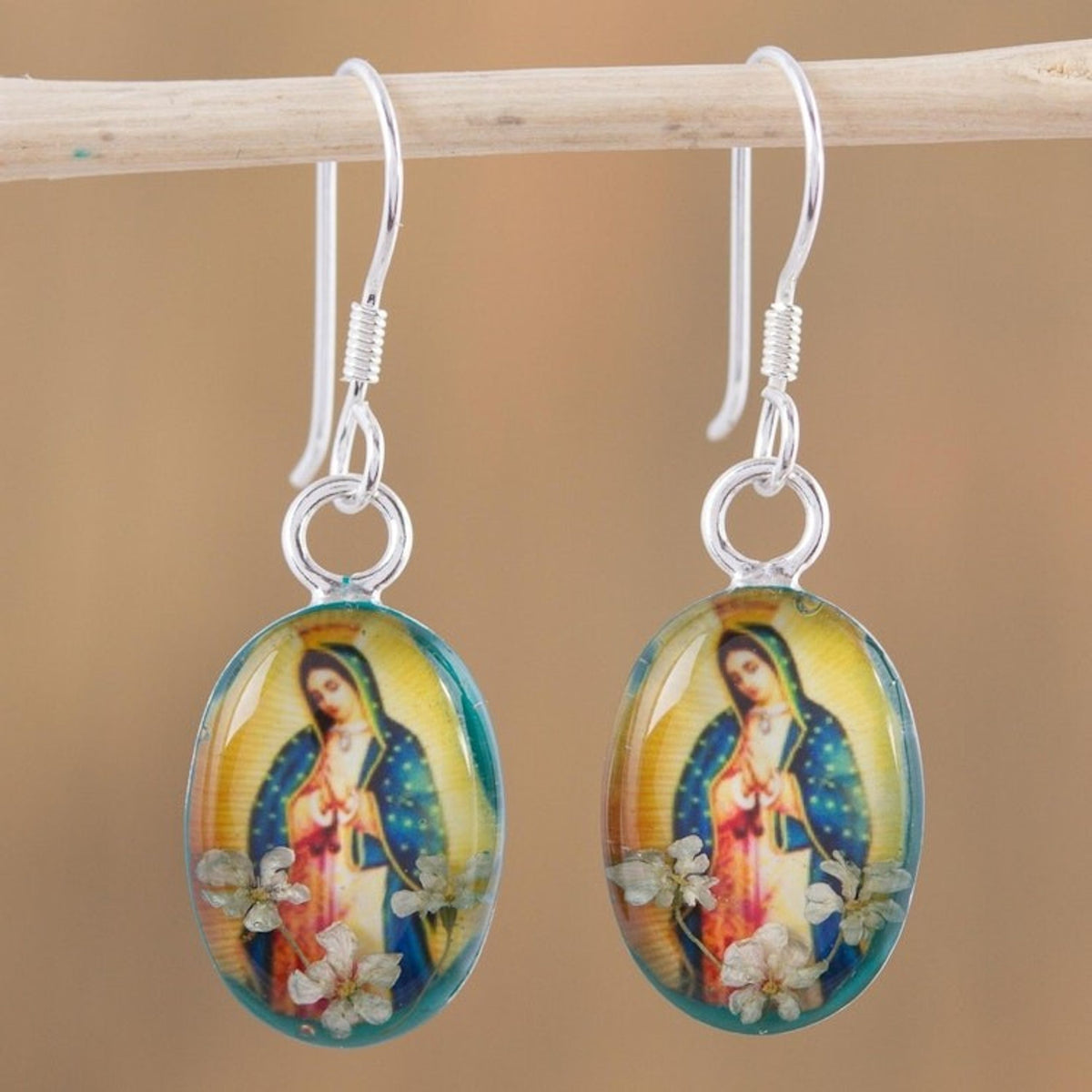 These Religious Natural Flower Dangle Earrings from Mexico 'Flowering Faith' by Independent Artisans are a striking pair of religious earrings that make an excellent companion. The earrings feature the image of the Virgen de Guadalupe (Mother Mary) flanked by petite natural flowers captured in resin. The flowers are preserved using a unique technique that maintains their natural shapes and colors. The earrings are worn on hooks of sterling silver and are a beautiful celebration of nature and faith.