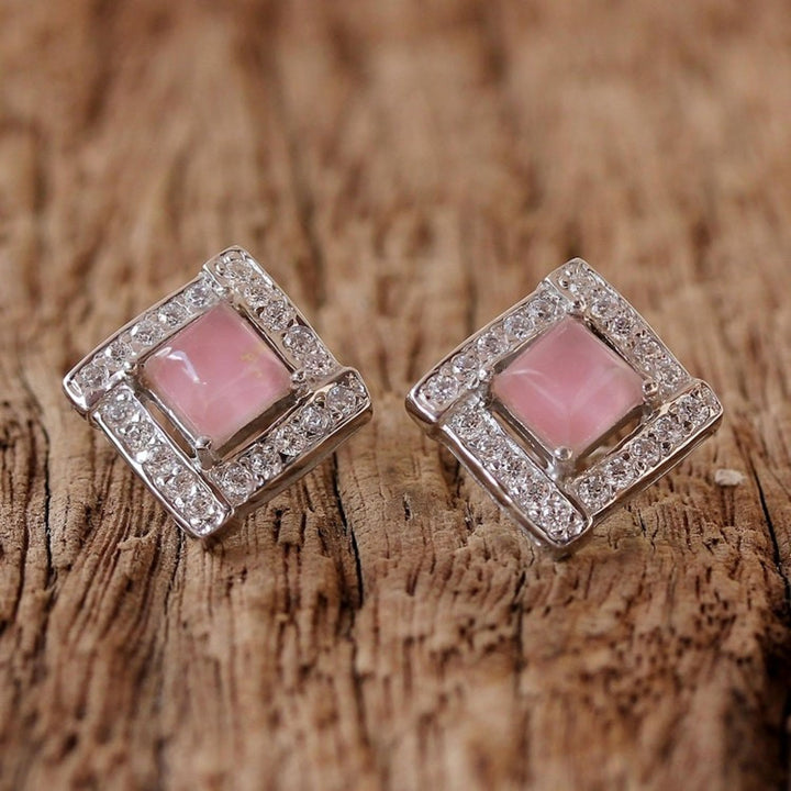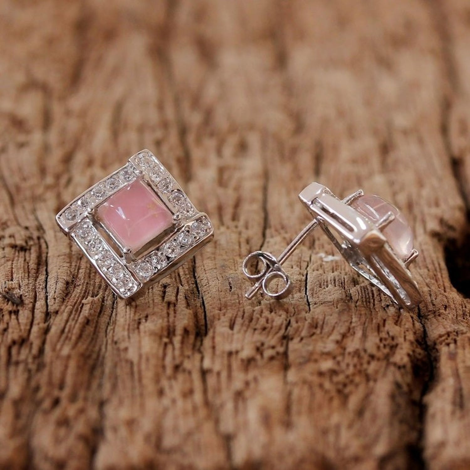 Rhodium Plated Rose Quartz Button Earrings from Thailand 'Pink Squares'