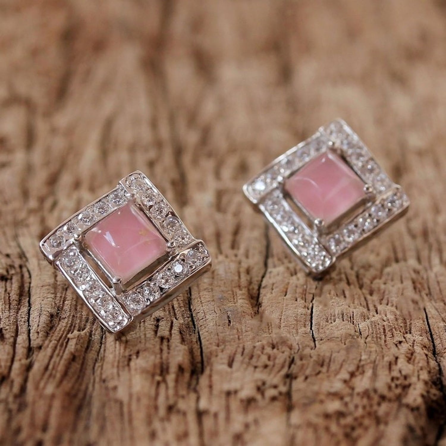 These Rhodium Plated Rose Quartz Button Earrings from Thailand 'Pink Squares' by Independent Artisans are a beautiful pair of button earrings. Designed by Michael Krainer, they feature squares of sparkling cubic zirconia that surround pink stones of rose quartz. The earrings are crafted of sterling silver bathed in rhodium with a high-polish finish, which adds a touch of glamour. These earrings are a perfect blend of elegance and artistry.