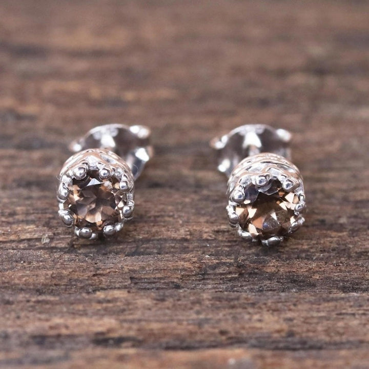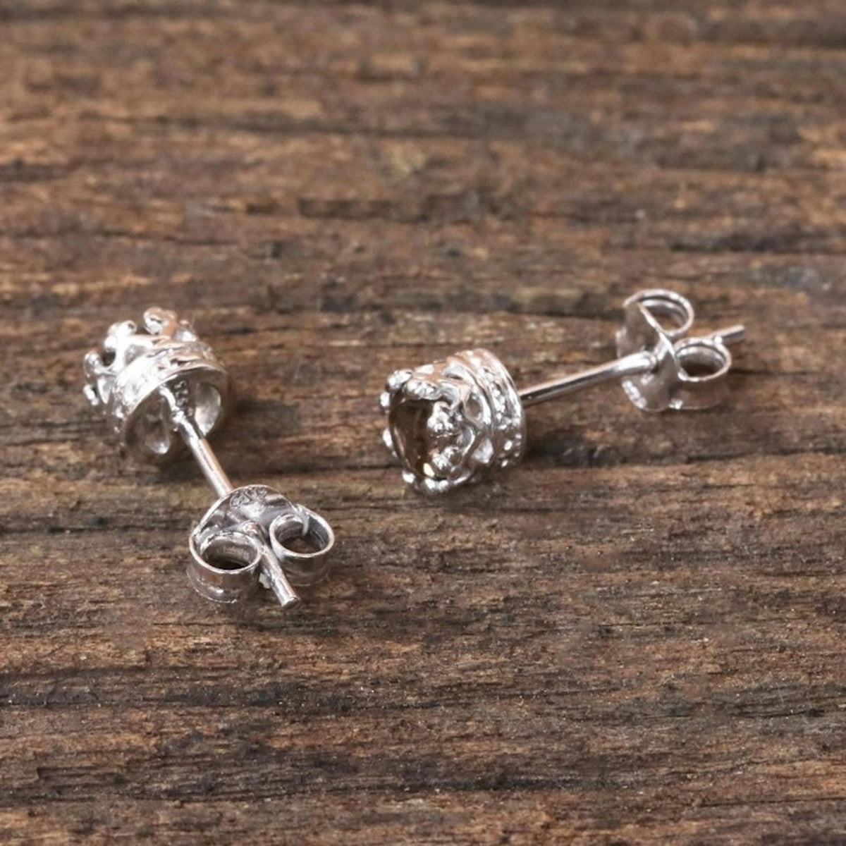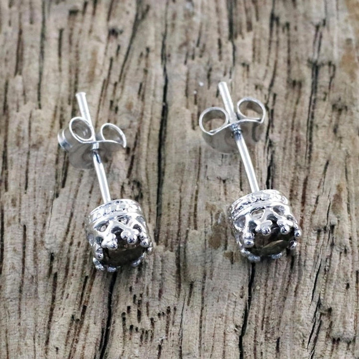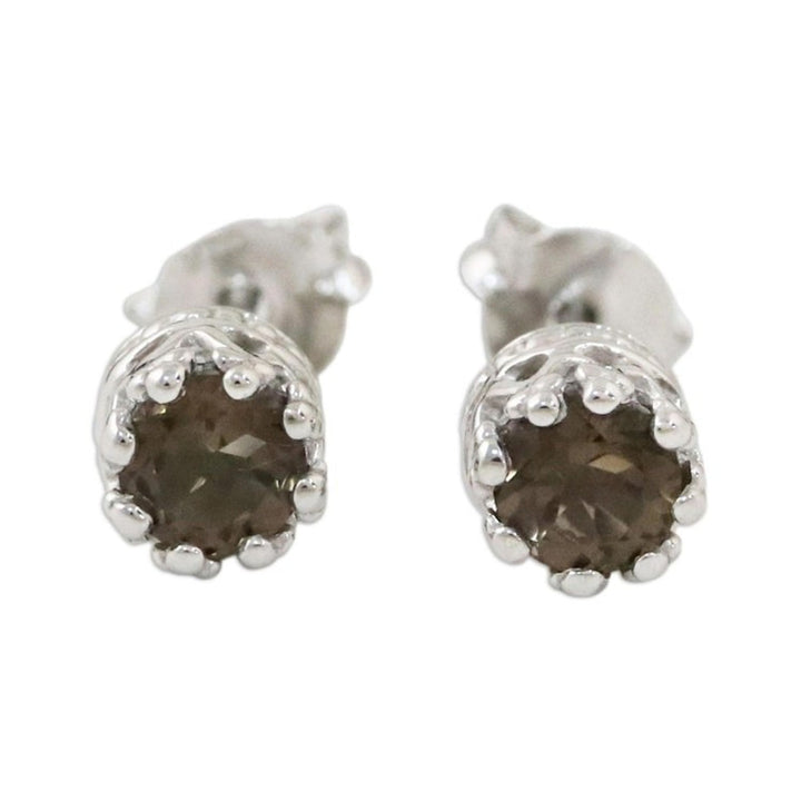 These Rhodium Plated Smoky Quartz Stud Earrings from Thailand 'Brilliant Splendor' by Independent Artisans are radiant stud earrings designed by Michael Krainer. They feature brilliant smoky quartz stones that glisten within crowns crafted from rhodium-plated sterling silver. These simple yet elegant earrings are a beautiful reflection of the artistry and soul of the family workshop in Bangkok.