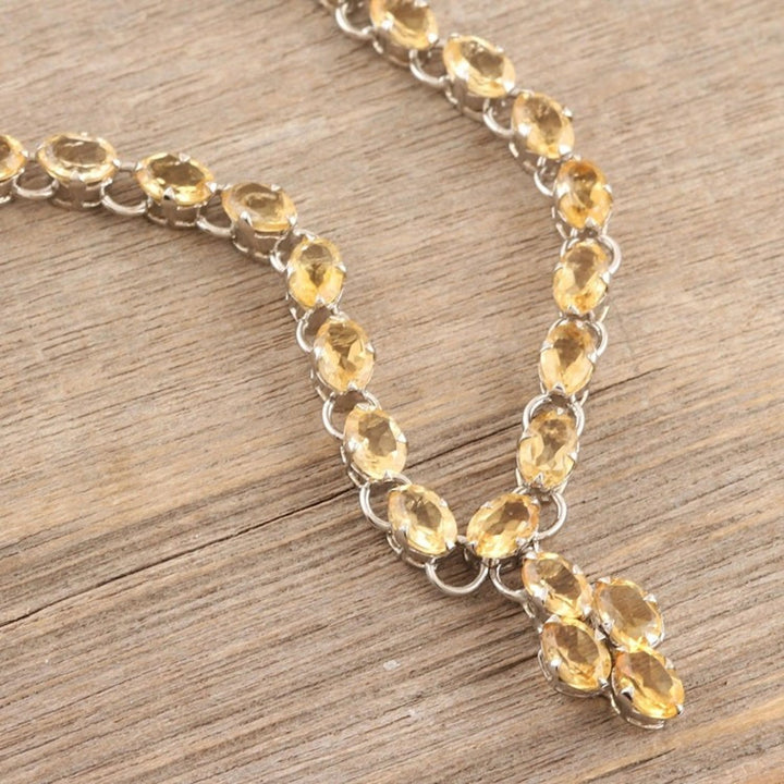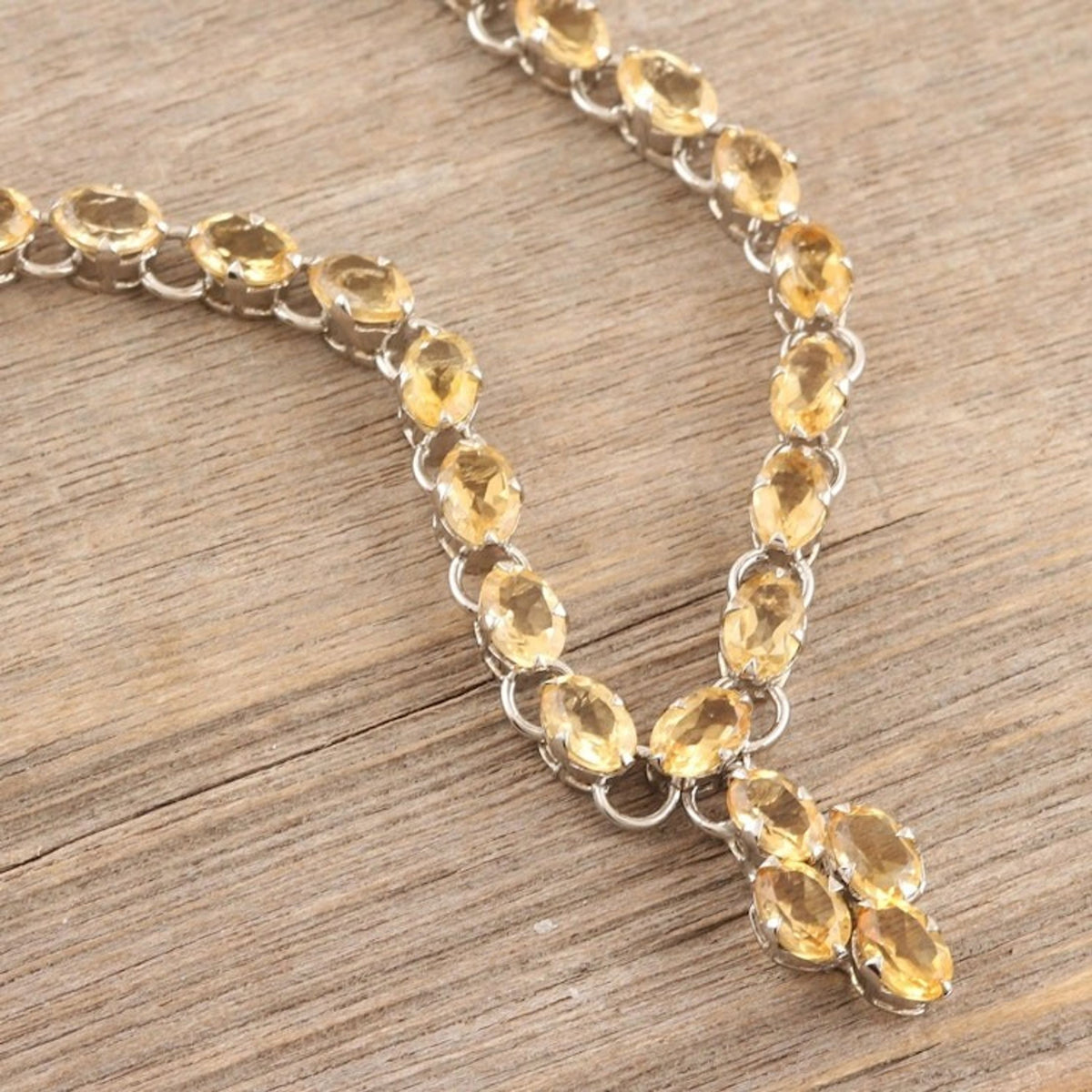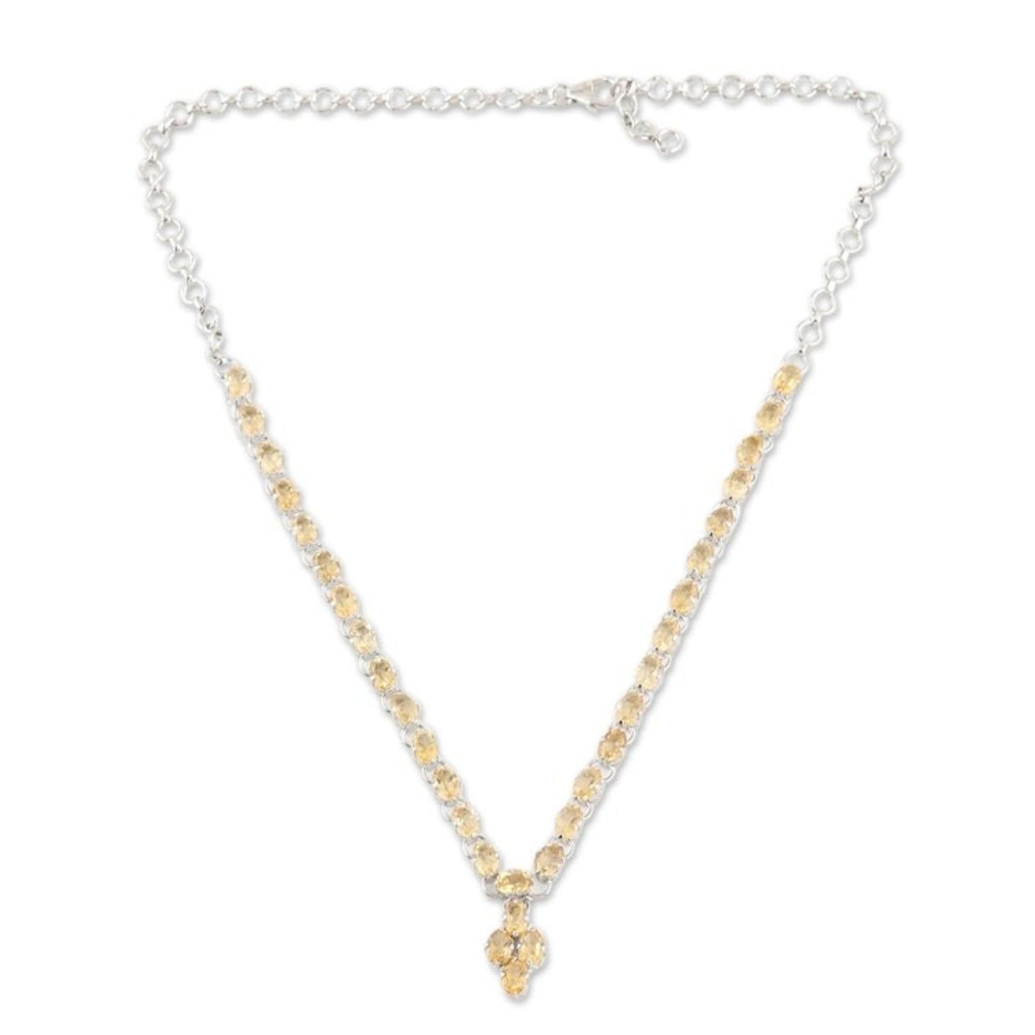 This Rhodium-Plated Sterling Silver Citrine Pendant Necklace 'Cheerful Music' by Independent Artisans is a lovely necklace where cool silver and bright yellow mingle. Designed by Alok Jain, the wide pendant is made from faceted citrine ovals totaling over 16 carats, linked together by petite rings. The necklace is finished with rhodium-plated sterling silver rings that fasten with a lobster claw clasp. This piece captures the essence of "cheerful music" with its vibrant design.