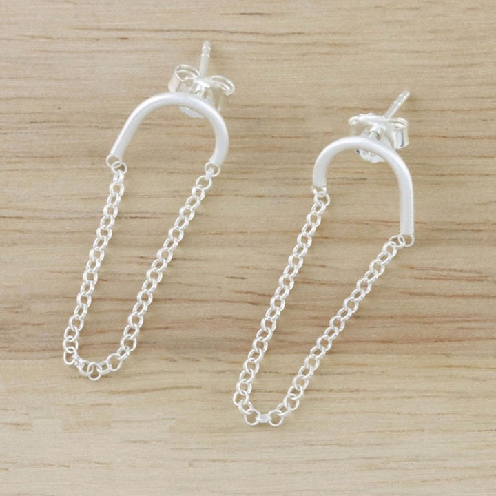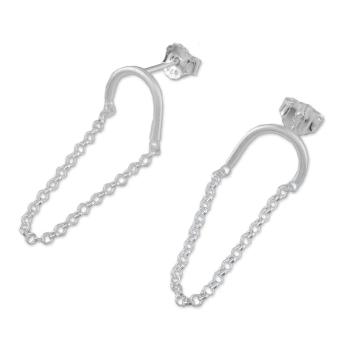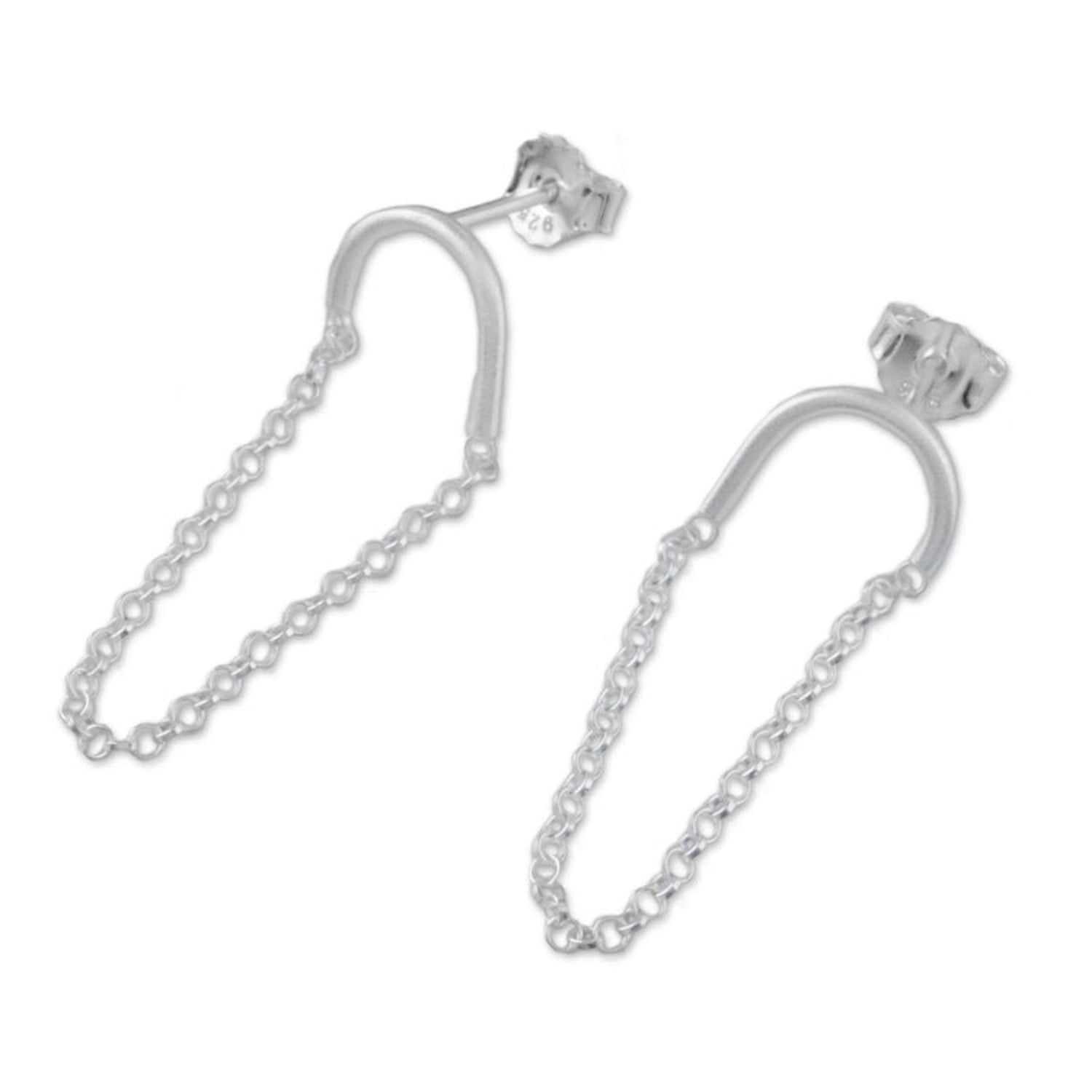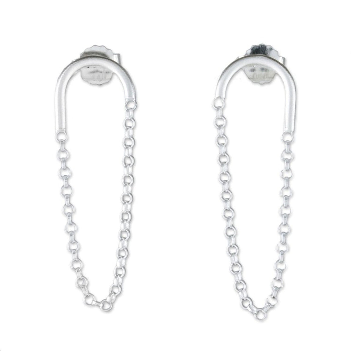 These Rolo Chain Sterling Silver Dangle Earrings from Thailand 'Chain Drop' by Independent Artisans are marvelous earrings with a modern appeal. Designed by Jantana, two horseshoes crafted of sterling silver host petite lengths of sterling rolo chain that dangle below. The earrings are accentuated with a brushed-satin finish, and they are a beautiful reflection of the artist's personal style and commitment to community.