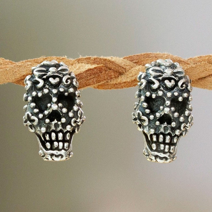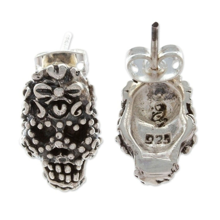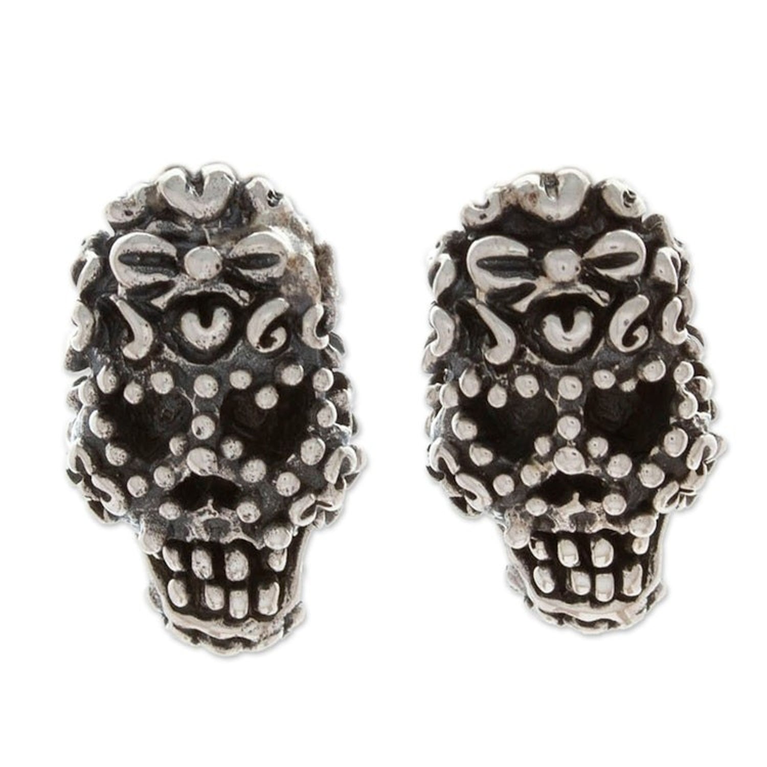 These Romantic Day of the Dead Folk Art Skull Button Earrings 'Deadly In Love' by Independent Artisans are a unique pair of button earrings inspired by the Day of the Dead. Designed by Ángel Ortiz, the sterling silver earrings feature skull motifs with oxidized details that enhance the romantic look. This piece is a beautiful blend of traditional silversmithing with contemporary techniques, and it is a testament to the artist's passion and commitment to his community.