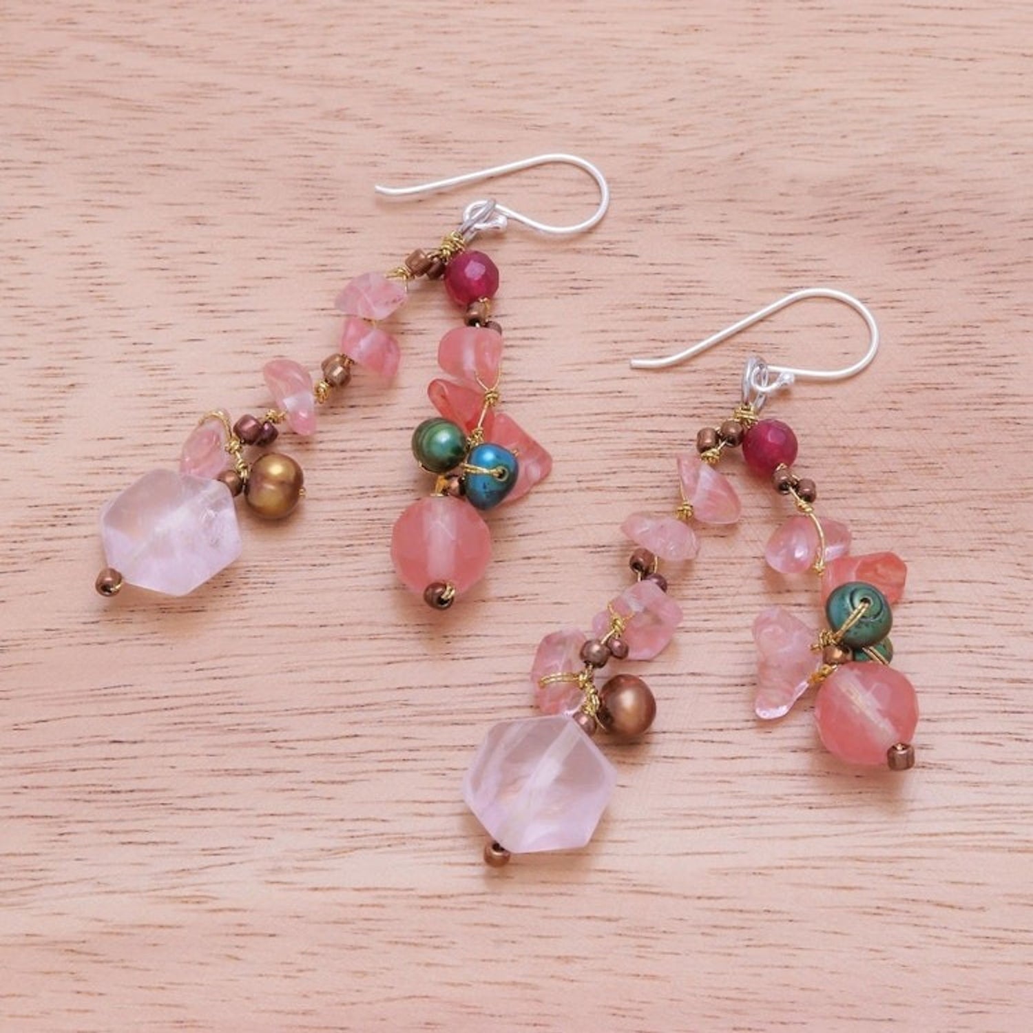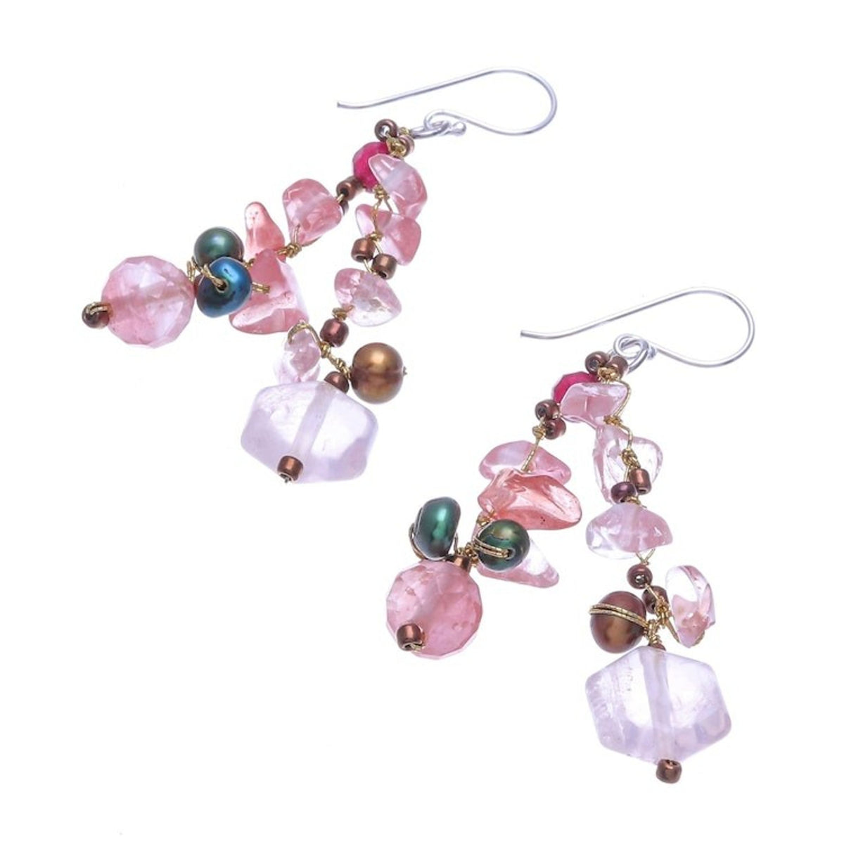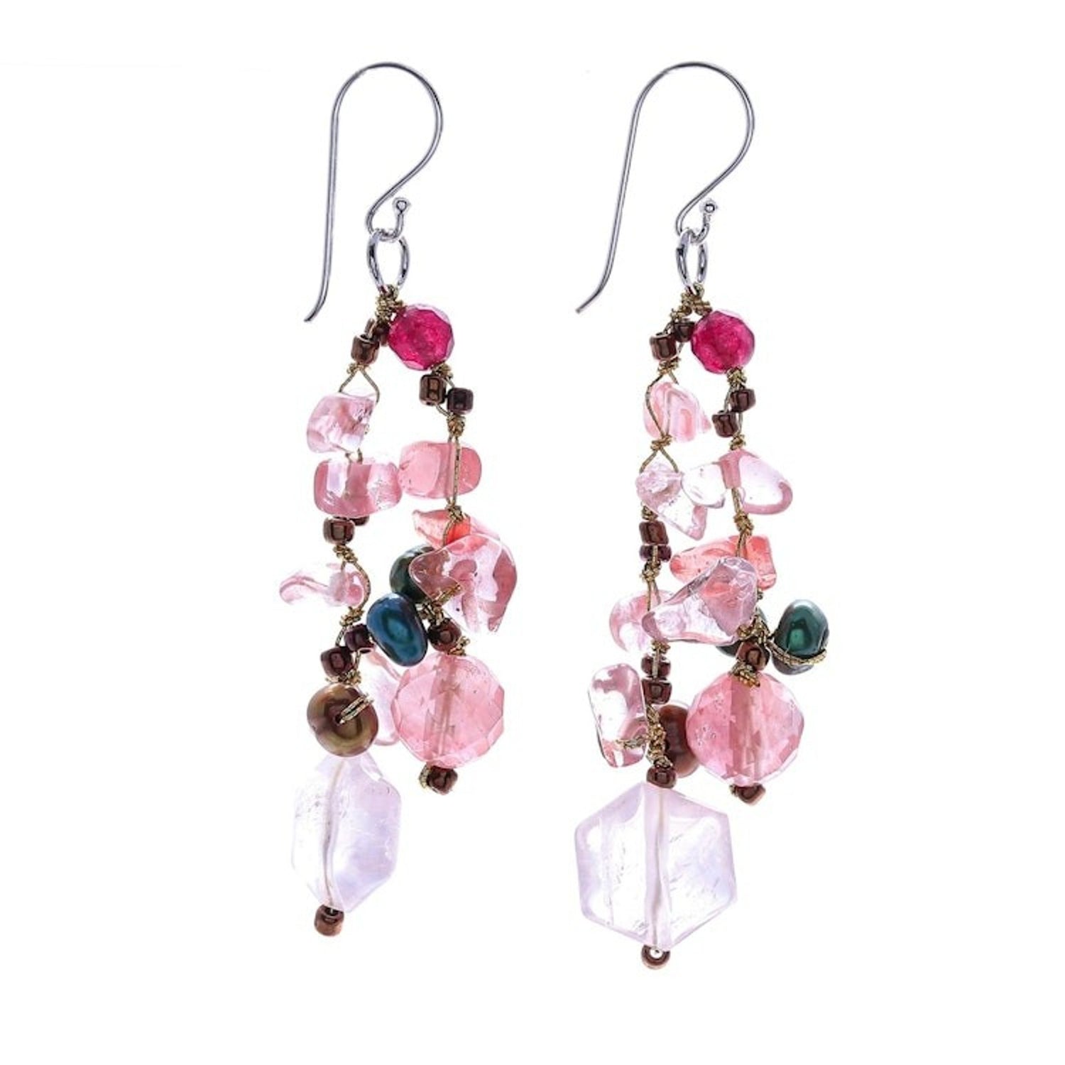 These Rose Quartz and Cultured Pearl Dangle Earrings 'Translucent Rose' by Independent Artisans are a colorful pair of dangle earrings with a unique design. Designed by Nareerat, the Thai artisan hand knots shimmering metallic thread around chips of dyed pink quartz, while rose quartz gems and faceted quartz add dimension. Cultured freshwater pearls dyed green and brown add a luminescent glow, and sterling silver hooks finish the pair with a bit of shine.