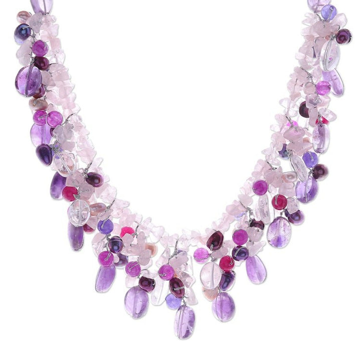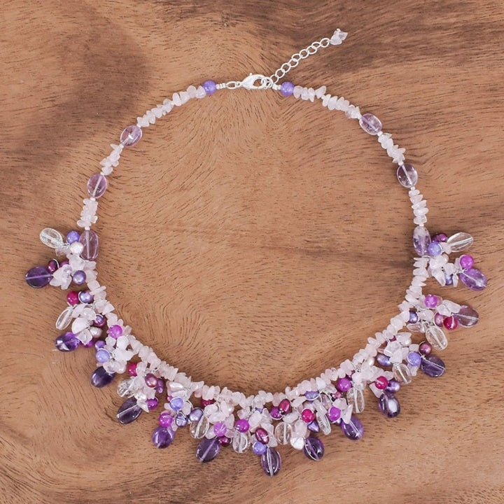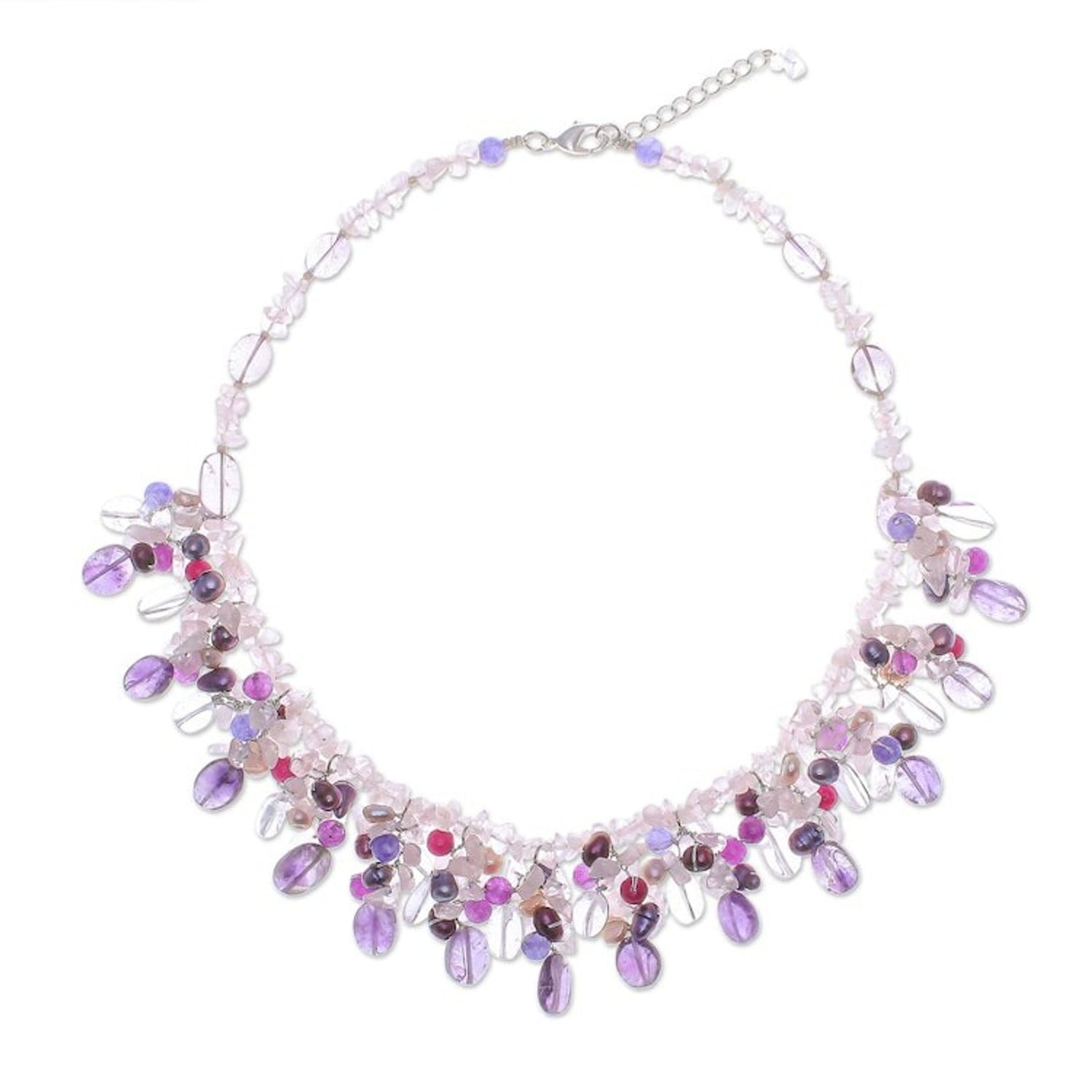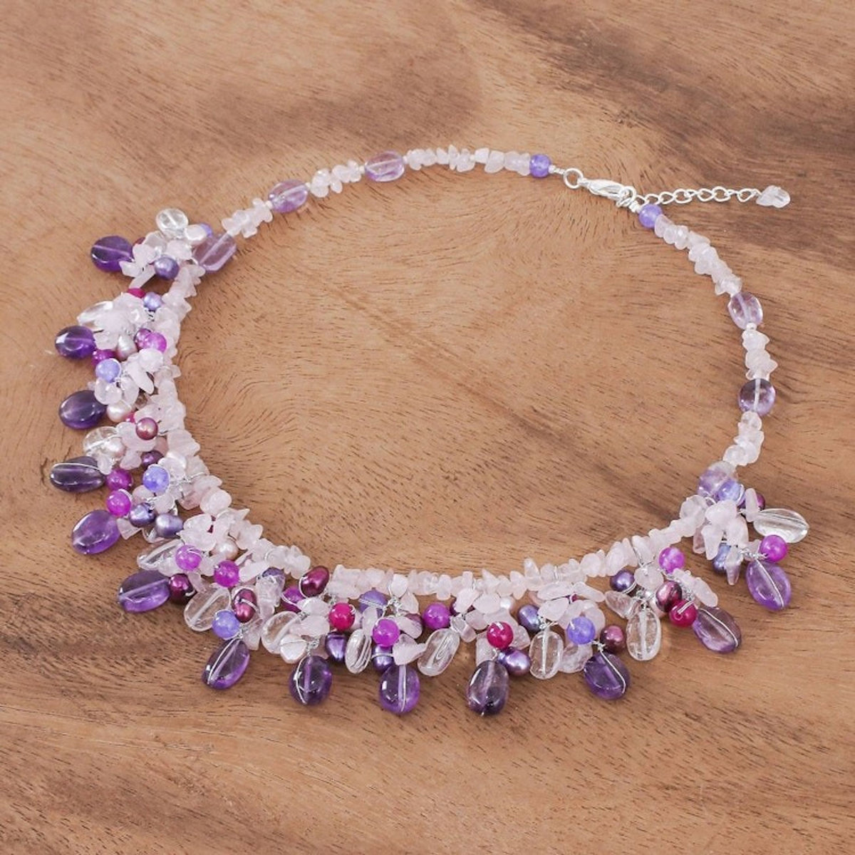 This Rose Quartz and Cultured Pearl Pendant Necklace 'Girl's Life' by Independent Artisans is an eye-catching pendant necklace with a cascade of pink and purple gems. Designed by Nareerat, the Thai artisan hand knots silvery silk thread around cultured freshwater pearls, amethyst, quartz, and rose quartz to create the necklace, embellishing the quartet of gems with glass beads. A sterling silver-plated brass lobster claw clasp finishes the necklace.