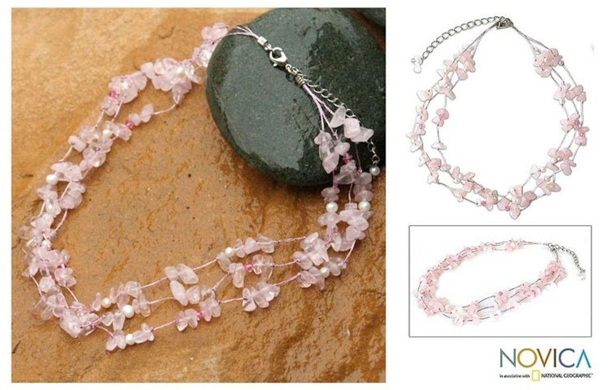 This Rose Quartz and Pearl Beaded Necklace 'Natural Spectacular' by Independent Artisans is a unique necklace that takes the shape of a shimmering garland. Designed by Sasina, she threads the necklace by hand with pearls and rose quartz that are steeped in light pink splendor. The necklace is a beautiful reflection of the artist's belief in the power of stones to bring luck and positivity.