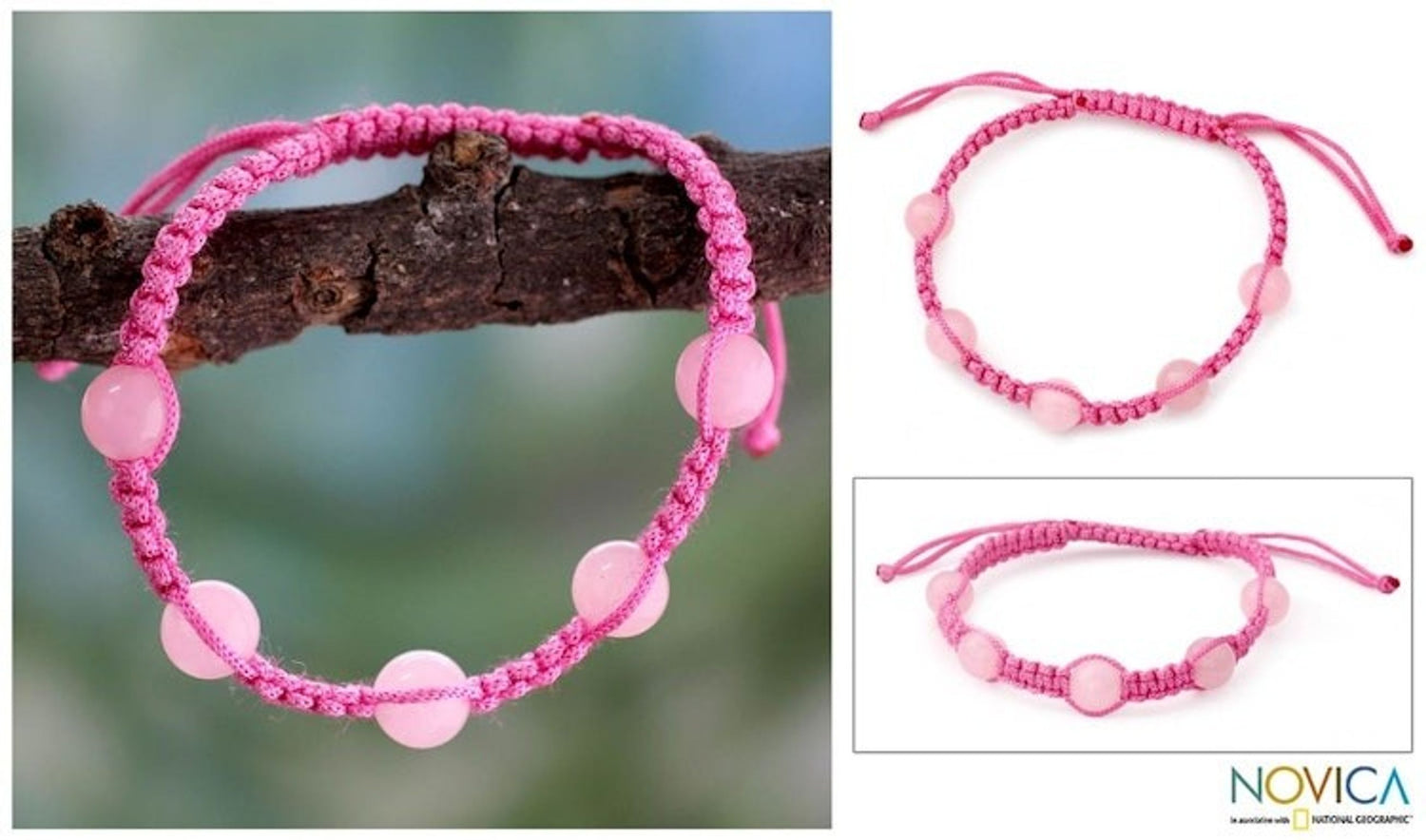 This Rose Quartz Shambhala-style Bracelet from India 'Harmony in Pink' by Independent Artisans is an adjustable macrame bracelet with a unique design. Designed by Hema, the bracelet features five rose quartz globes and is knotted by hand. This is a Shambhala-style bracelet, symbolizing tranquility, peace, and happiness. Thought to ignite the pink flame of love, rose quartz surrounds the wearer in an aura of beauty.