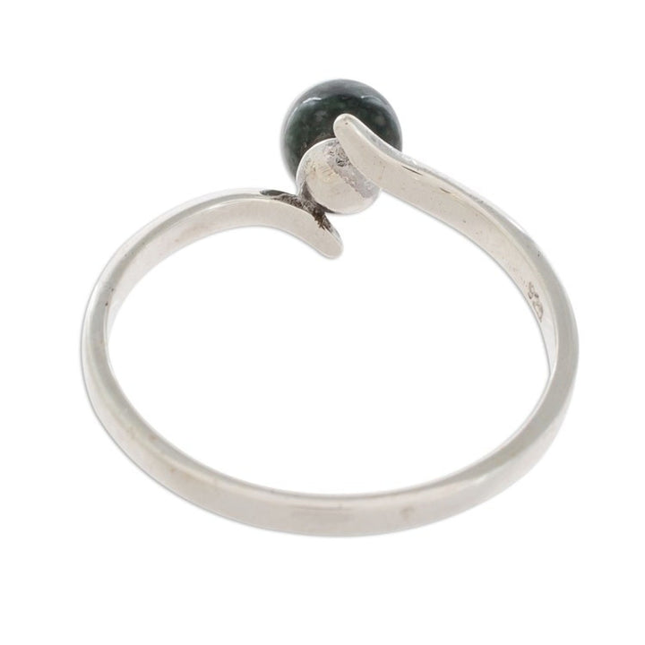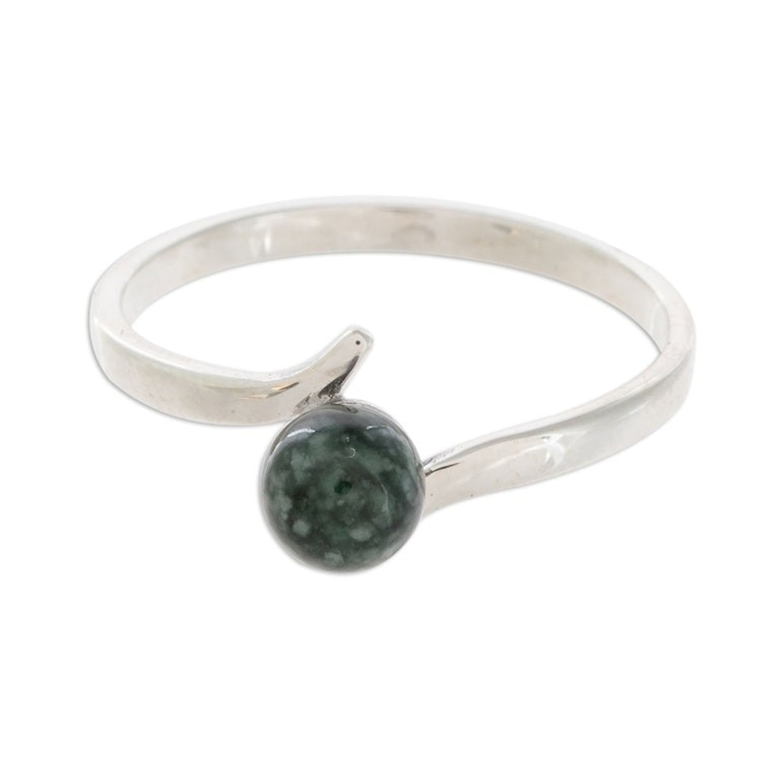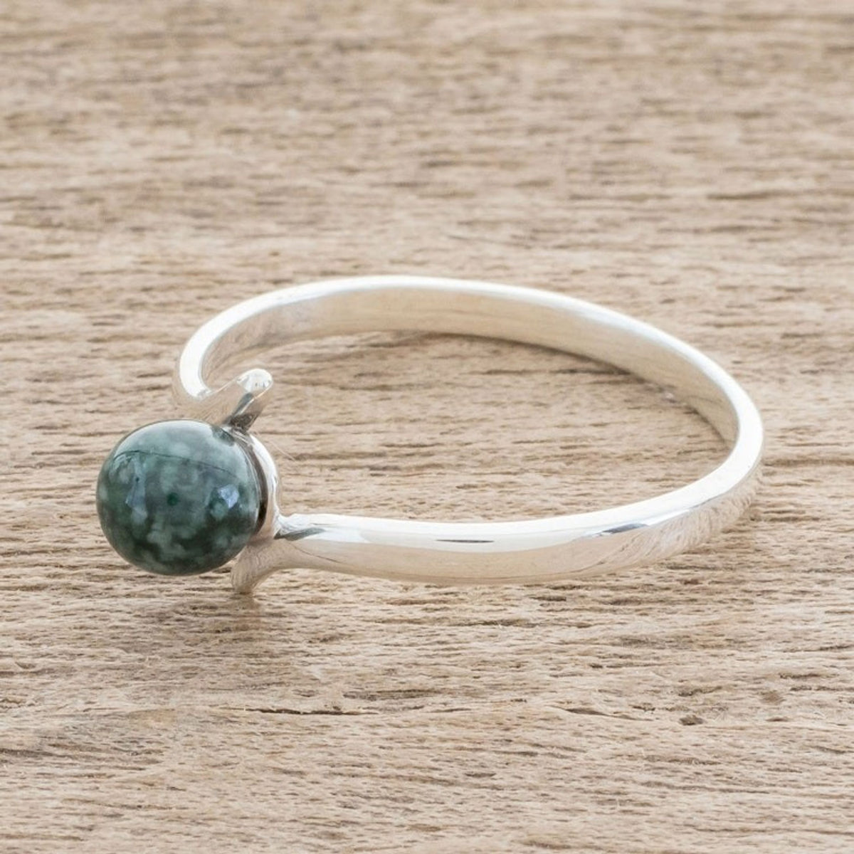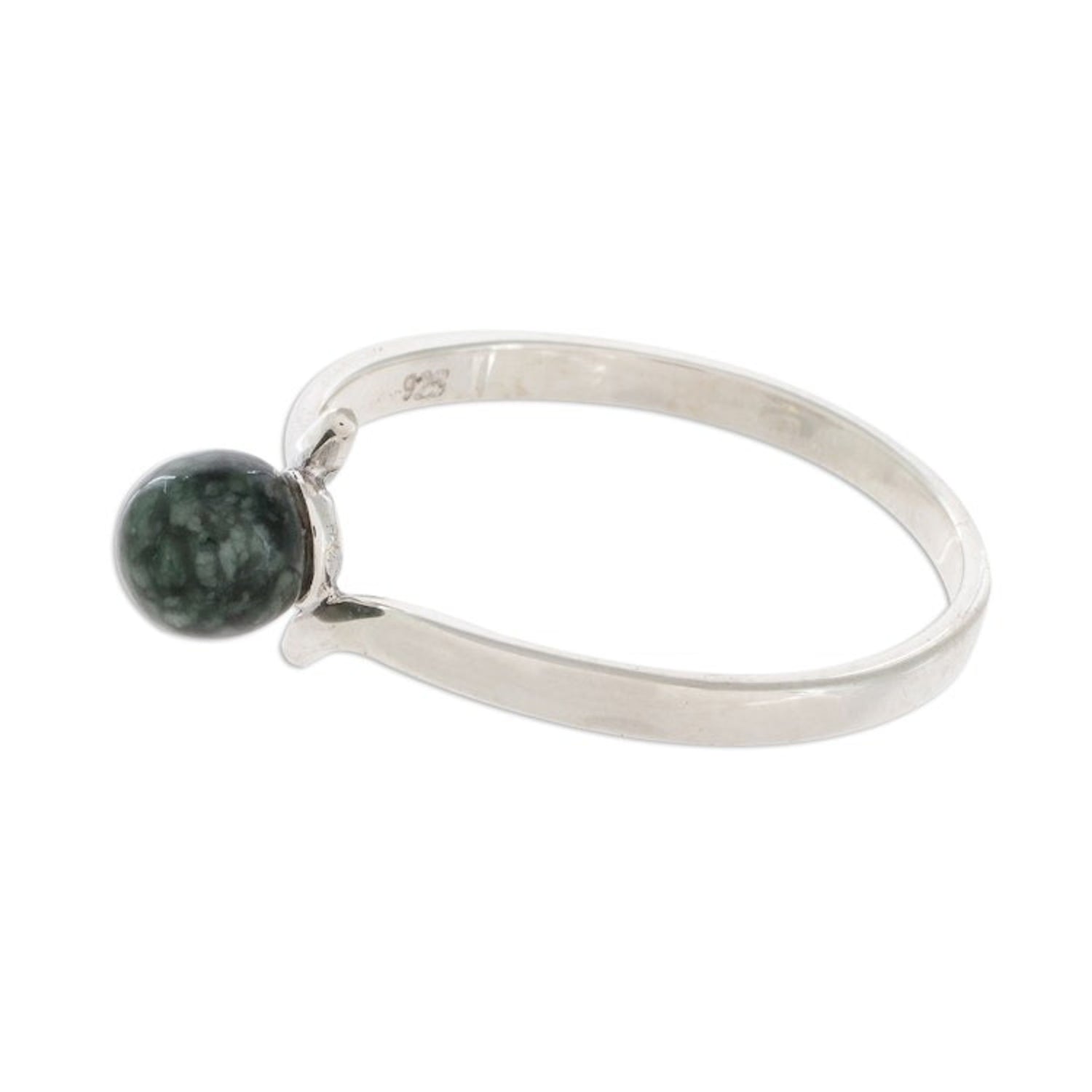 This Round Jade Single-Stone Ring in Dark Green from Guatemala 'Abstract Orb in Dark Green' by Independent Artisans is a single-stone ring with a contemporary design. Designed by Nicte Migliozzi, an orb of dark green jade is cradled by sterling silver. The ring circles the finger with a simple sterling band and is a beautiful blend of a modern design sensibility with local artistry.