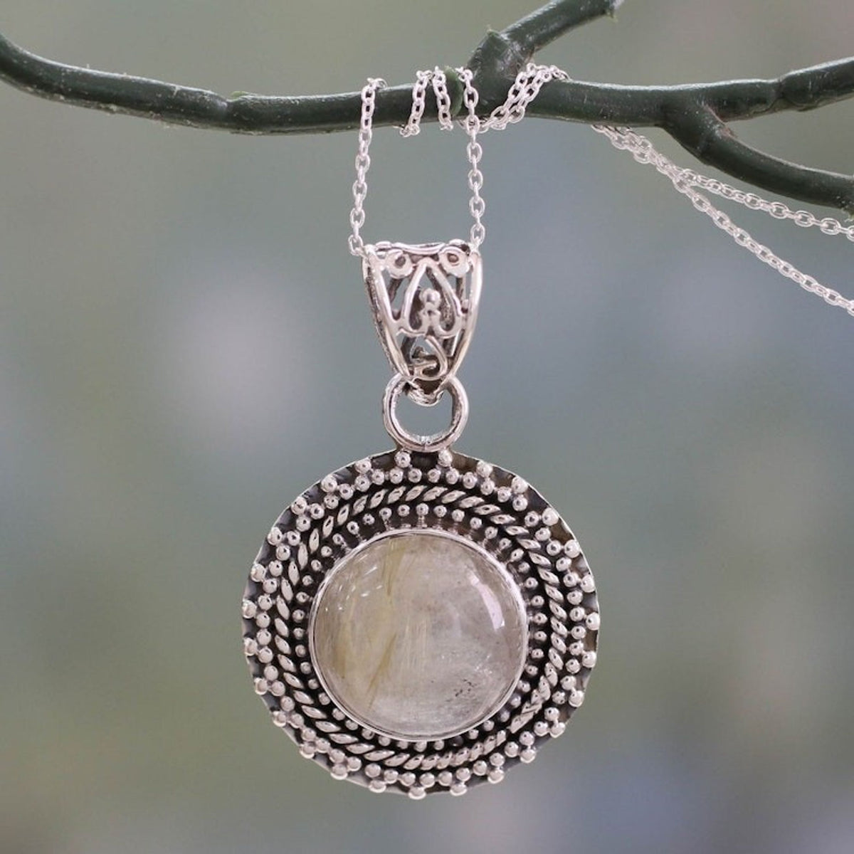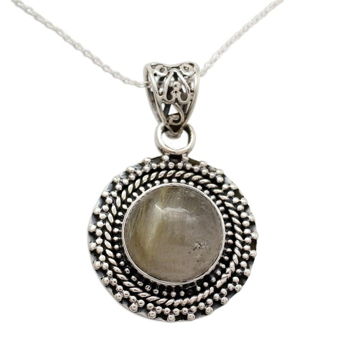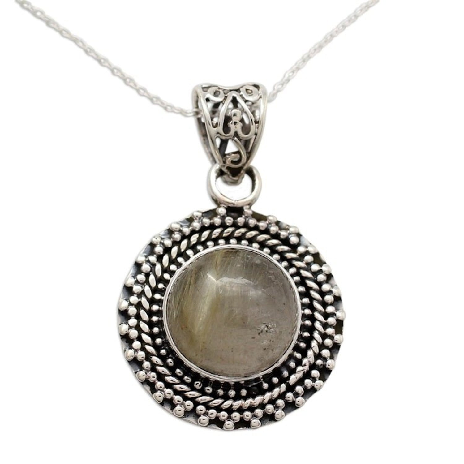 This Rutilated Quartz Pendant Necklace in Sterling Silver 'Golden Hair' by Independent Artisans is an intriguing pendant necklace. Designed by Aparna, rutilated quartz, sometimes called 'hair of Venus,' centers the necklace. The natural gemstone features interesting inclusions resembling strands of golden hair. The round gemstone cabochon is set in a sterling silver setting adorned with rope and beading details.