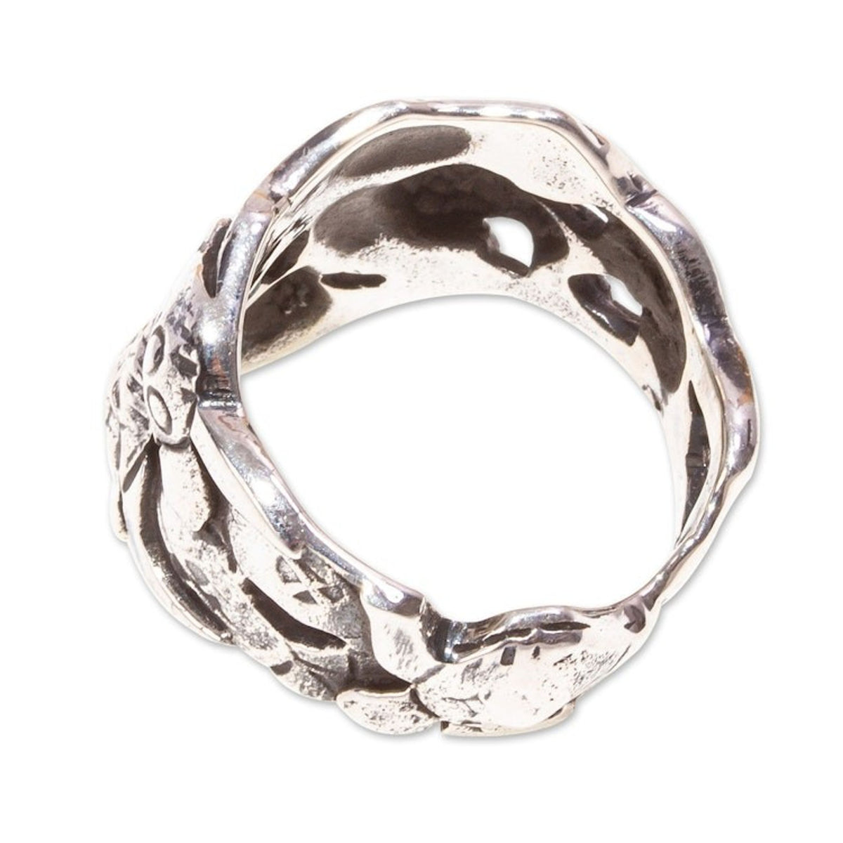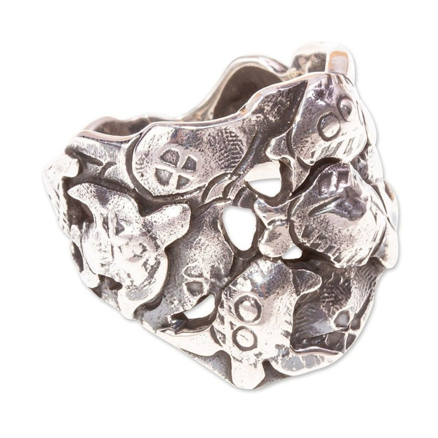 This Sea Turtle Design 950 Silver Ring from Mexico 'Marine World' by Independent Artisans is a detailed ring with a unique marine world design. Crafted by Alon Diller using the lost wax technique, the ring is made from 950 silver with oxidized touches that highlight the hand-carved turtle designs.