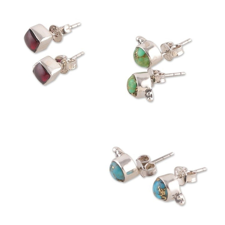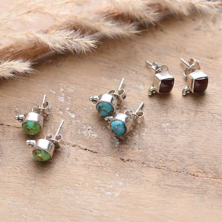 This Set of 3 Composite Turquoise and Garnet Stud Earrings 'Primaveral Appeal' by Independent Artisans is a sublime set of stud earrings that exude a sophisticated aura. Presented by Narayani, the set includes three sterling silver pairs, each decorated with composite turquoise or garnet jewels to let your aura bloom as a primaveral garden.