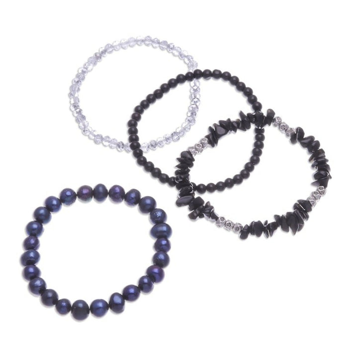 This Set of 4 Black Beaded Stretch Bracelets from Thailand 'Fancy Dream in Black' by Independent Artisans is a set of four beaded stretch bracelets with elegant black tones. Designed by Nareerat, they feature onyx chips, glass beads, cultured pearls, and silver accents in luxurious designs that complement any style.