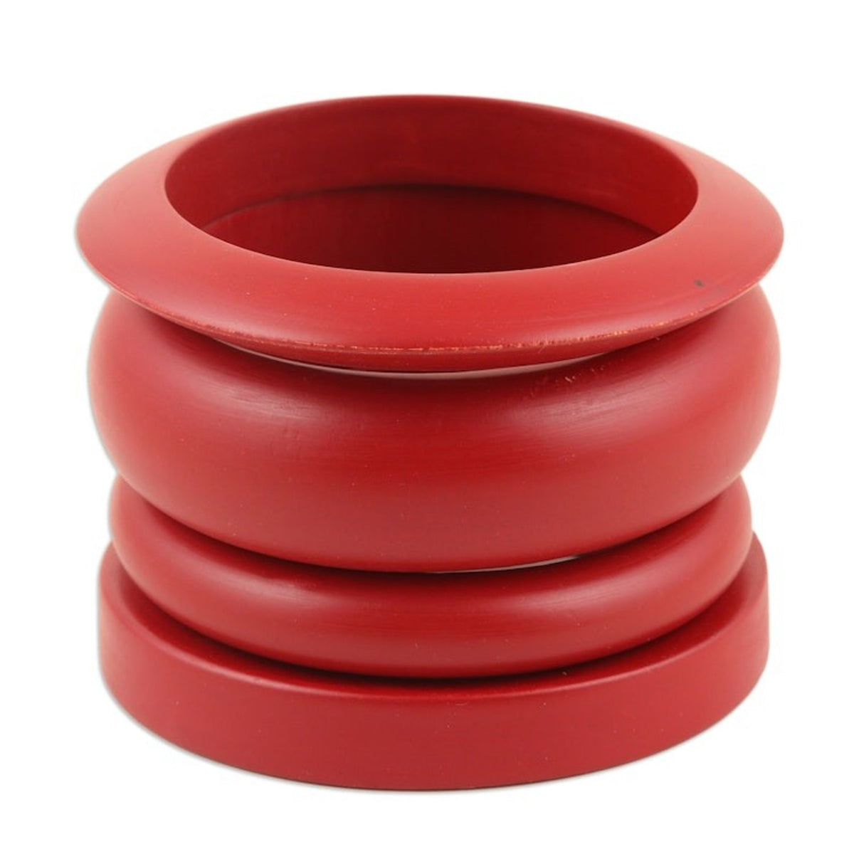 This Set of 4 Mango Wood Claret Bangle Bracelets from India 'Claret Fusion' by Independent Artisans is a set of four bangle bracelets. Presented by Vipin, they are crafted from mango wood and are hand-painted in a vibrant claret hue. The stylish creations feature different shapes enhanced with a polished finish.