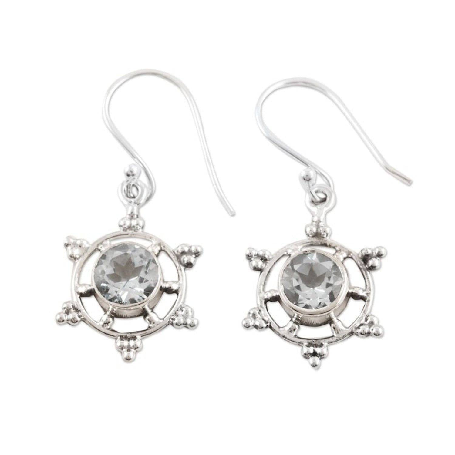 These Ship Wheel-Shaped Silver Dangle Earrings with Blue Topaz 'Chic Wheel' by Independent Artisans are a pair of dangle earrings that stand out with a unique design reminiscent of a ship steering wheel. Presented by Narayani, the elegant earrings go with everything thanks to their openwork accents and shimmering blue topaz gemstones.