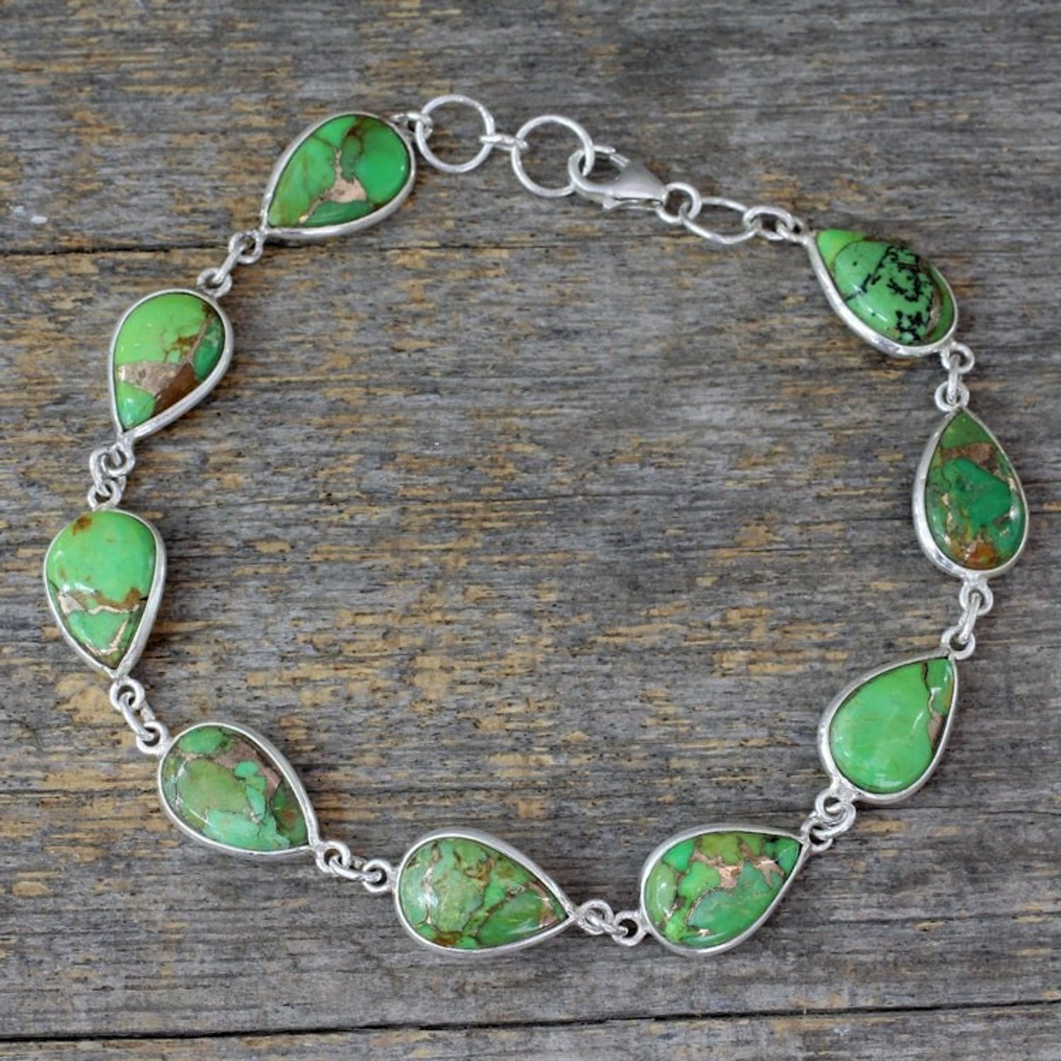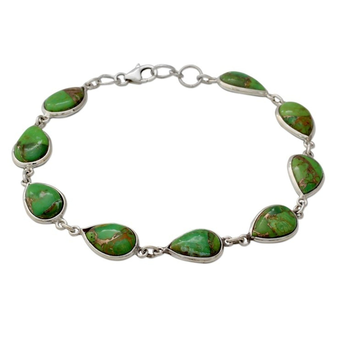 This Silver 925 Bracelet Crafted with Green Composite Turquoise 'Serenity in Green' by Independent Artisans is a beautiful bracelet with nine gemstone teardrops that encircle the wrist with color. Designed by Aparna, composite turquoise with golden-veined tones of green is set in sterling silver.