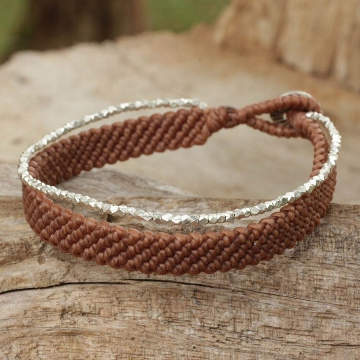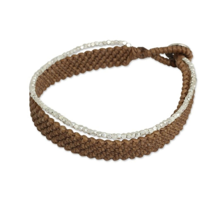 This Silver 950 Hill Tribe Beaded Brown Cord Bracelet 'Blithe Brown' by Independent Artisans is a fun wristband bracelet. Presented by Napapat, a band of knotted sepia-brown cords is complemented by a slender strand of glimmering silver beads. The beads are crafted by Karen hill tribe artisans and a distinctive silver button secures the bracelet.