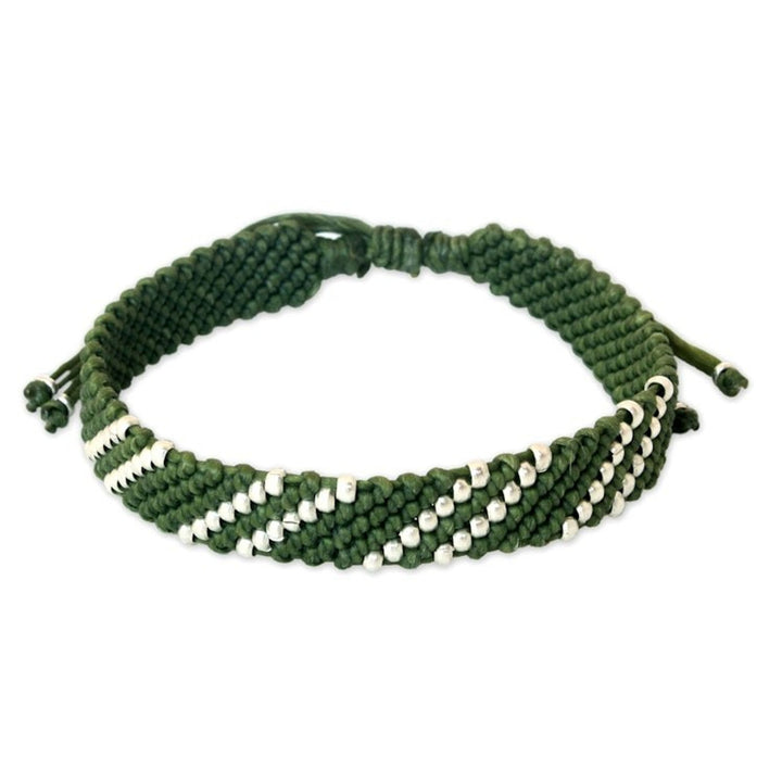 This Silver accent wristband bracelet 'Diagonal Green' by Independent Artisans is a macrame bracelet. Designed by Napapat, shining silver beads are knotted by hand on green cords, forming diagonal rows. The bracelet slips over the wrist, and the length can be adjusted by sliding the knot.
