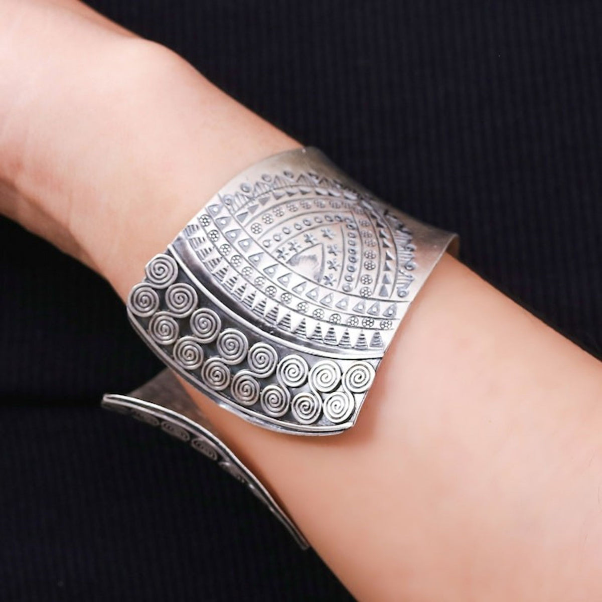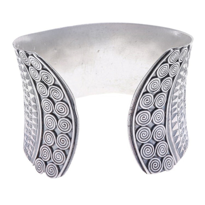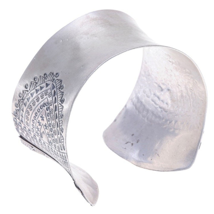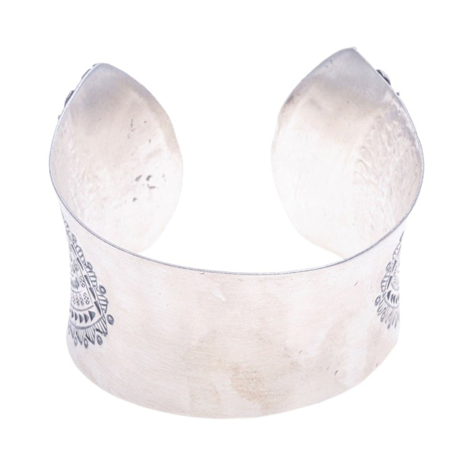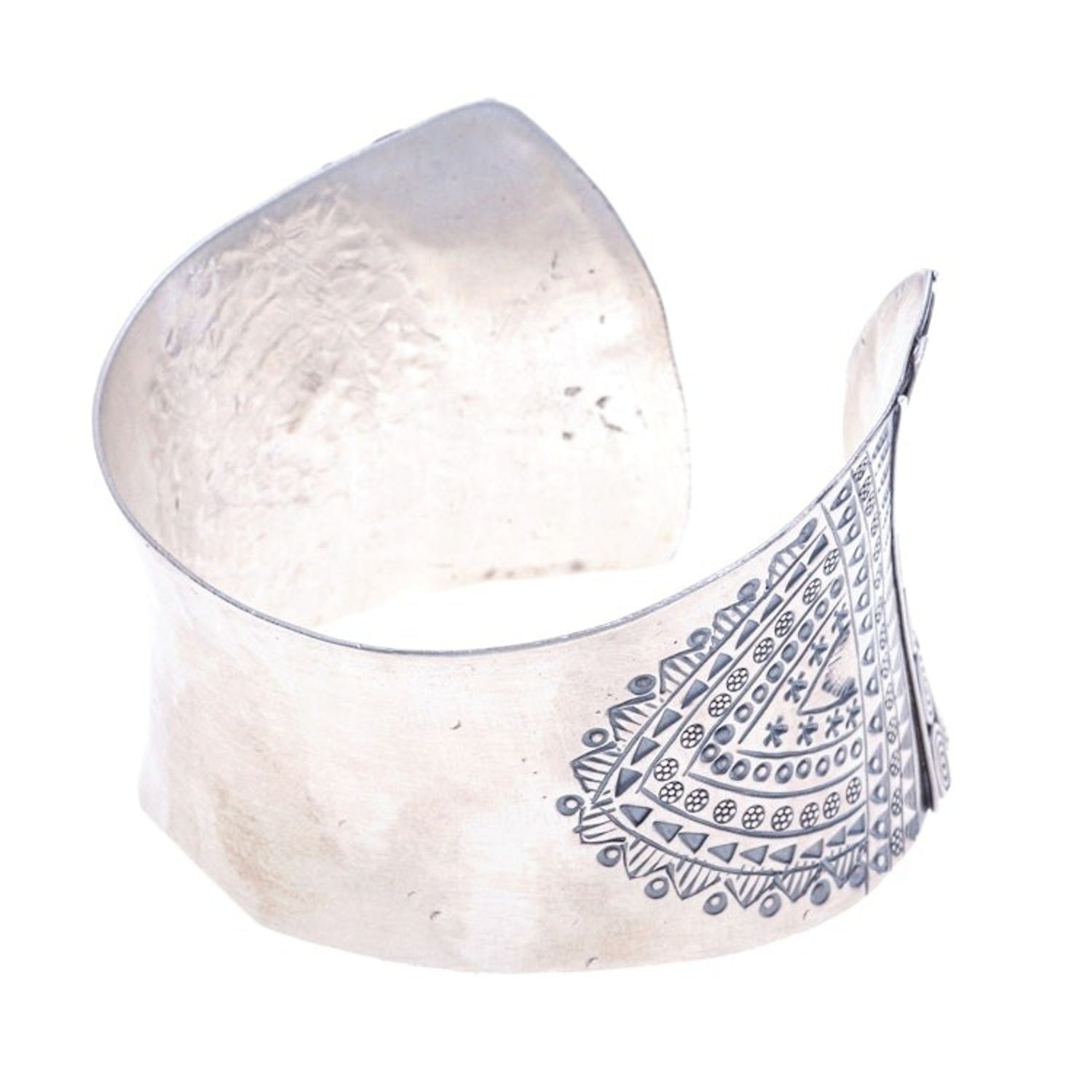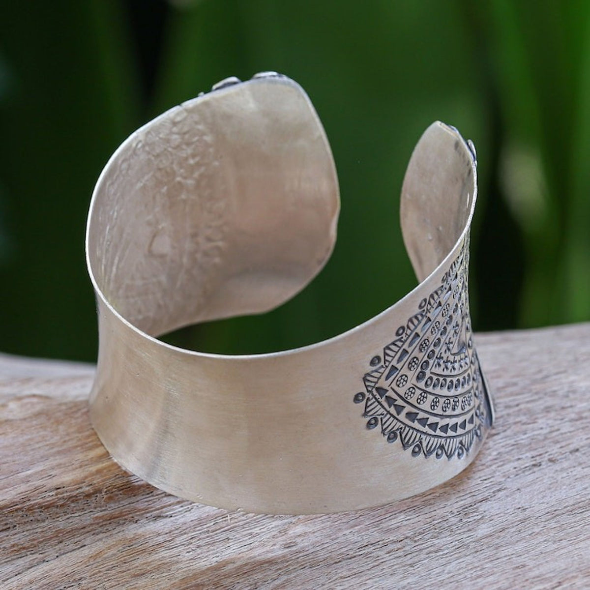 This 'Ancestor Treasure' Silver Cuff Bracelet with Hill Tribe Motifs by Independent Artisans is a celebration of traditional Hill Tribe artistry. Crafted by local artisans, this silver cuff bracelet features a polished finish that enhances the intricate details and motifs inspired by the region's rich cultural heritage. The wide band and subtle engravings make it a bold yet elegant accessory that carries the beauty and history of Thailand on your wrist. It's a treasured piece that connects you to ancient traditions.