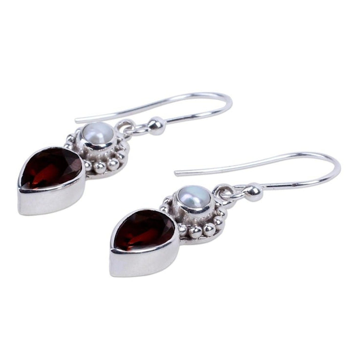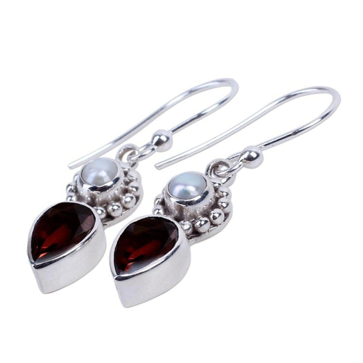Silver Cultured Pearl Earrings with Garnet from India 'Scarlet Tear'