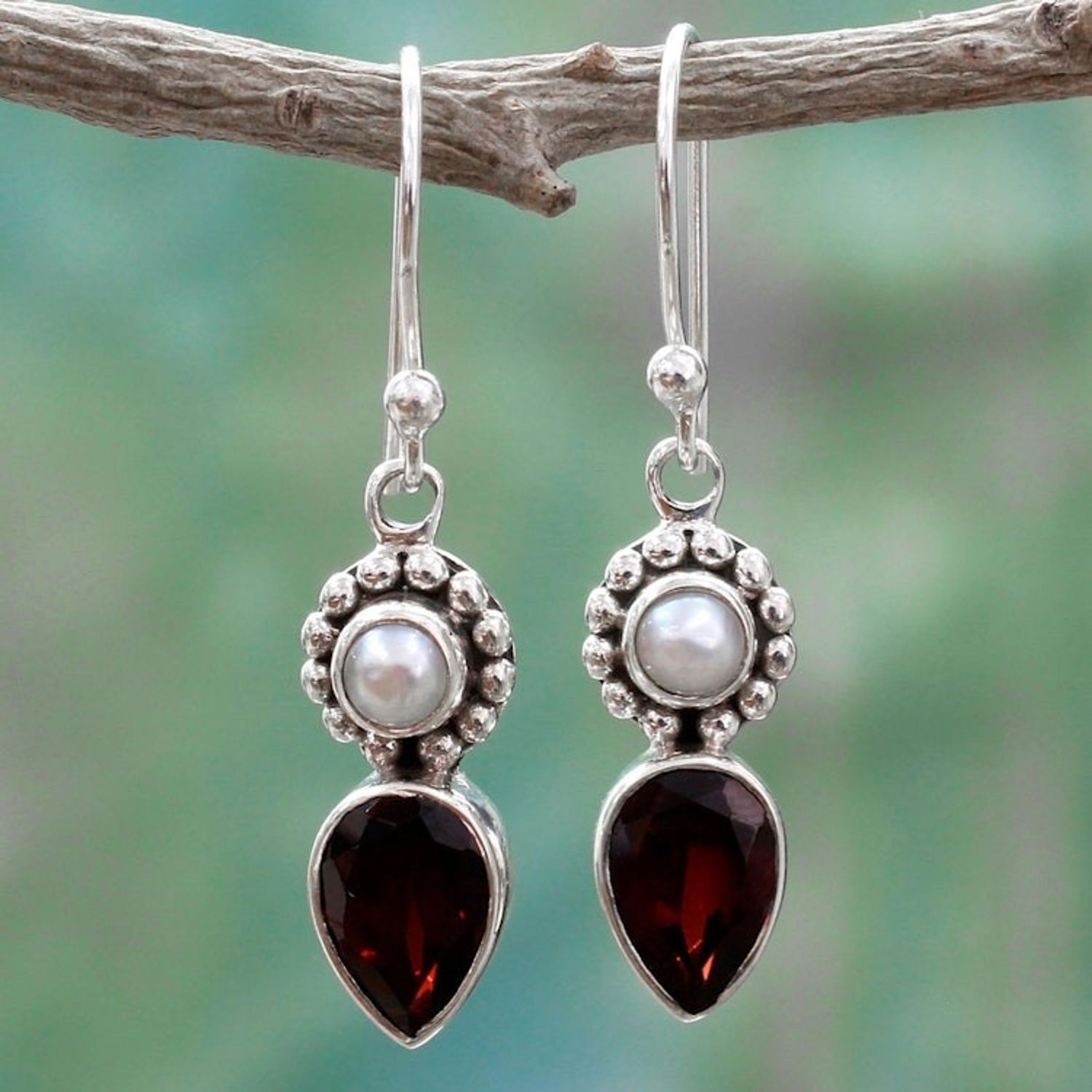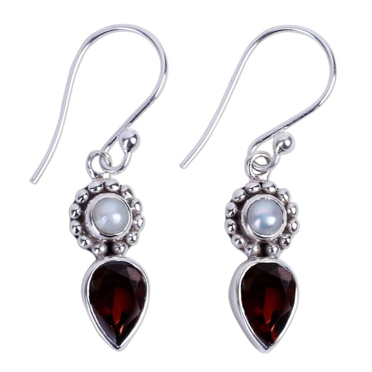 Handcrafted in India, these hook earrings are made from sterling silver, cultured freshwater pearls, and garnet with a combination finish. The total weight is 0.18 oz. Each earring measures 1.4 inches L x 0.3 inches W x 0.2 inches D. Natural stone variations are to be expected.