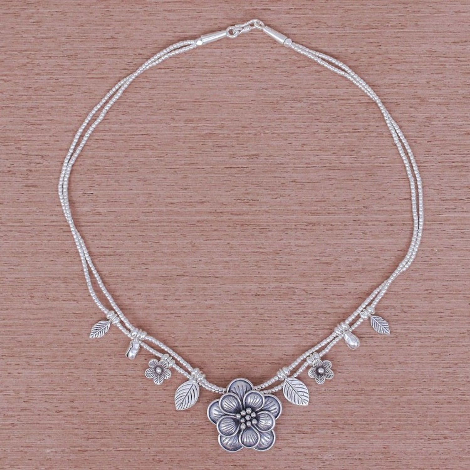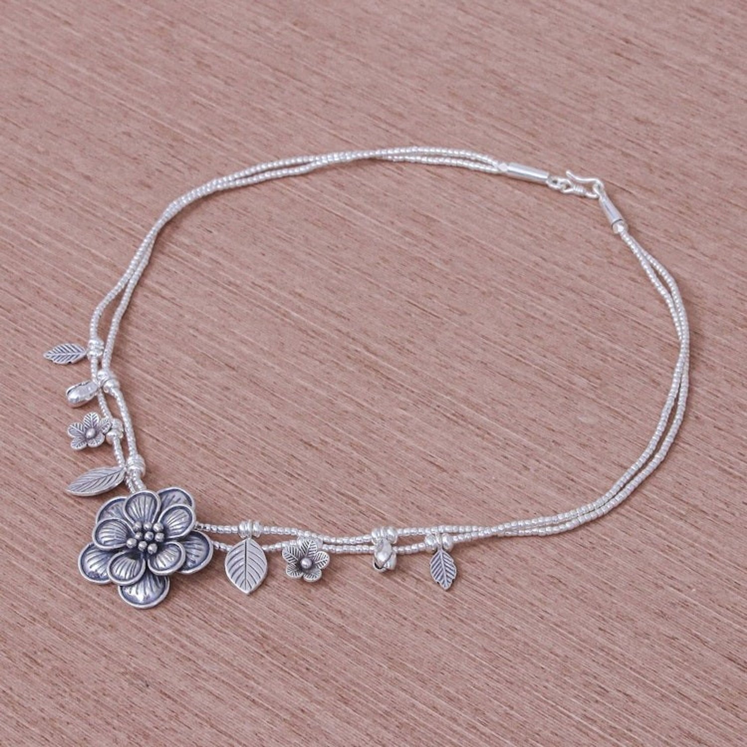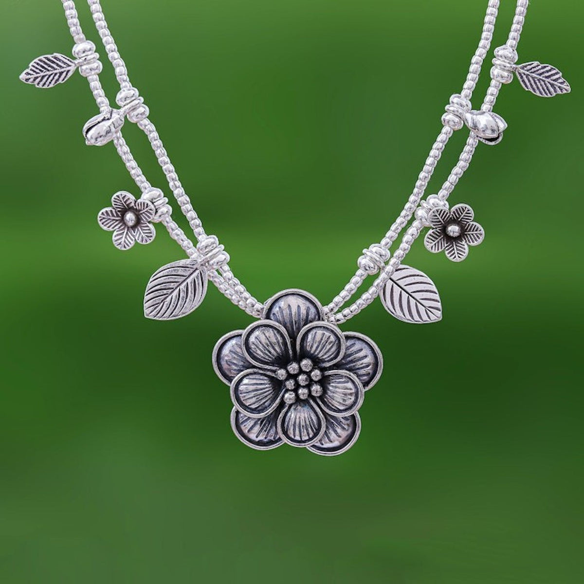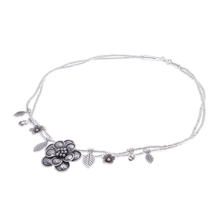 This 'Karen Daisy' Silver Flower Two Strand Charm Necklace by Independent Artisans is a beautiful showcase of traditional Karen Hill Tribe silversmithing techniques. Two strands of .950 silver beads are adorned with a charming collection of small charms, including leaves, blossoms, and rosebuds, leading down to an oxidized handmade flower pendant. This necklace is a celebration of nature-inspired design and cultural heritage, offering a piece that is both intricate and deeply personal.