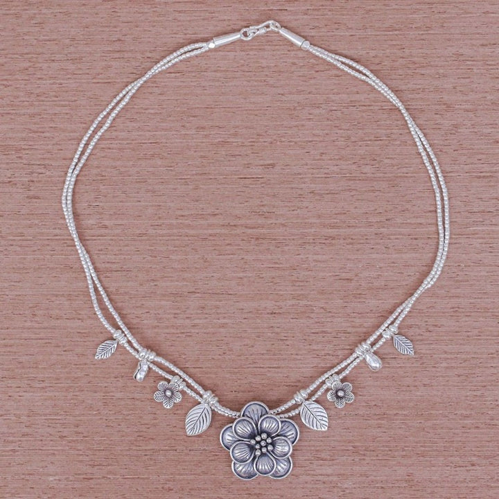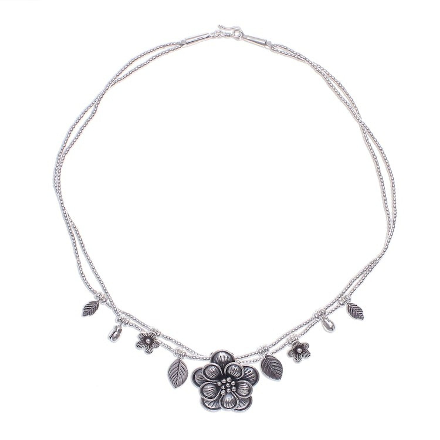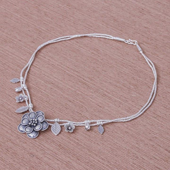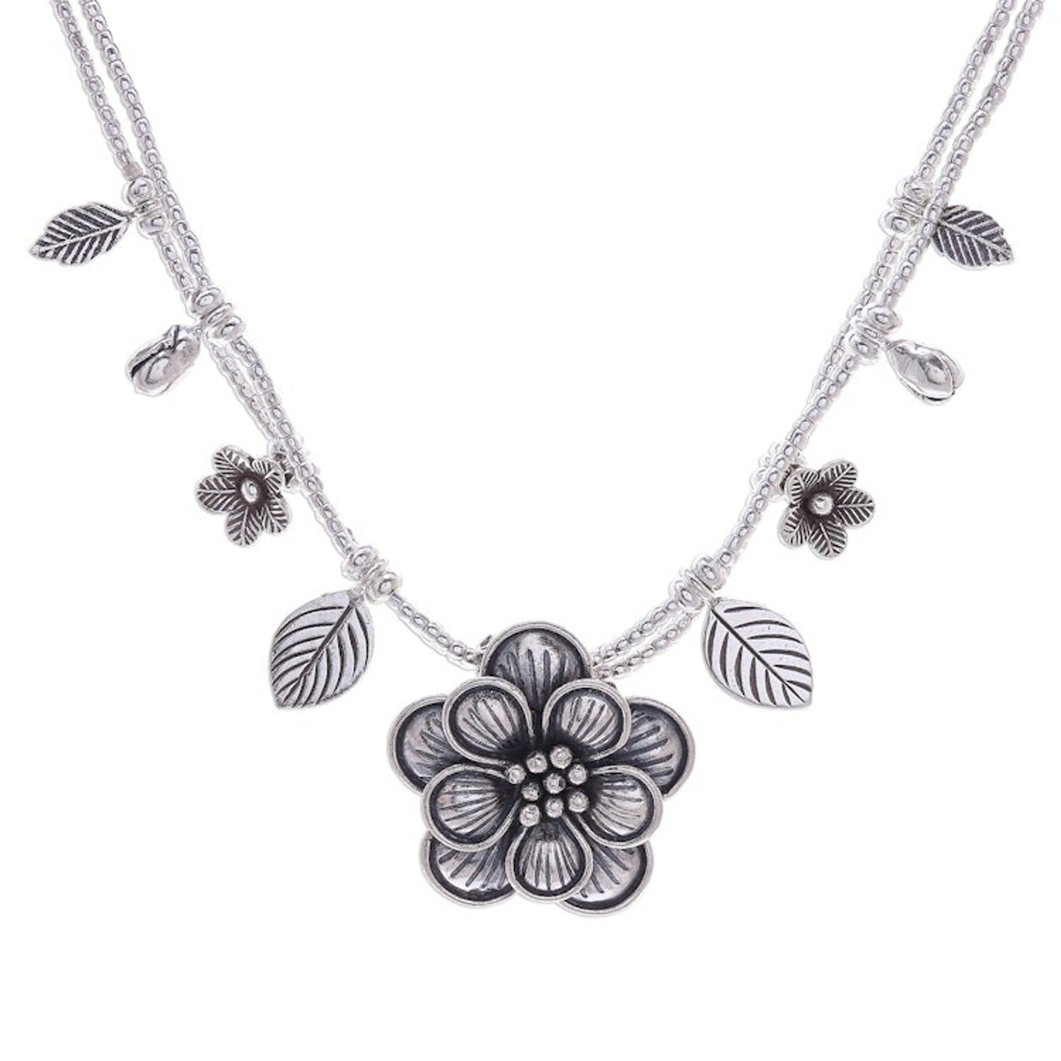 This 'Karen Daisy' Silver Flower Two Strand Charm Necklace by Independent Artisans is a beautiful showcase of traditional Karen Hill Tribe silversmithing techniques. Two strands of .950 silver beads are adorned with a charming collection of small charms, including leaves, blossoms, and rosebuds, leading down to an oxidized handmade flower pendant. This necklace is a celebration of nature-inspired design and cultural heritage, offering a piece that is both intricate and deeply personal.
