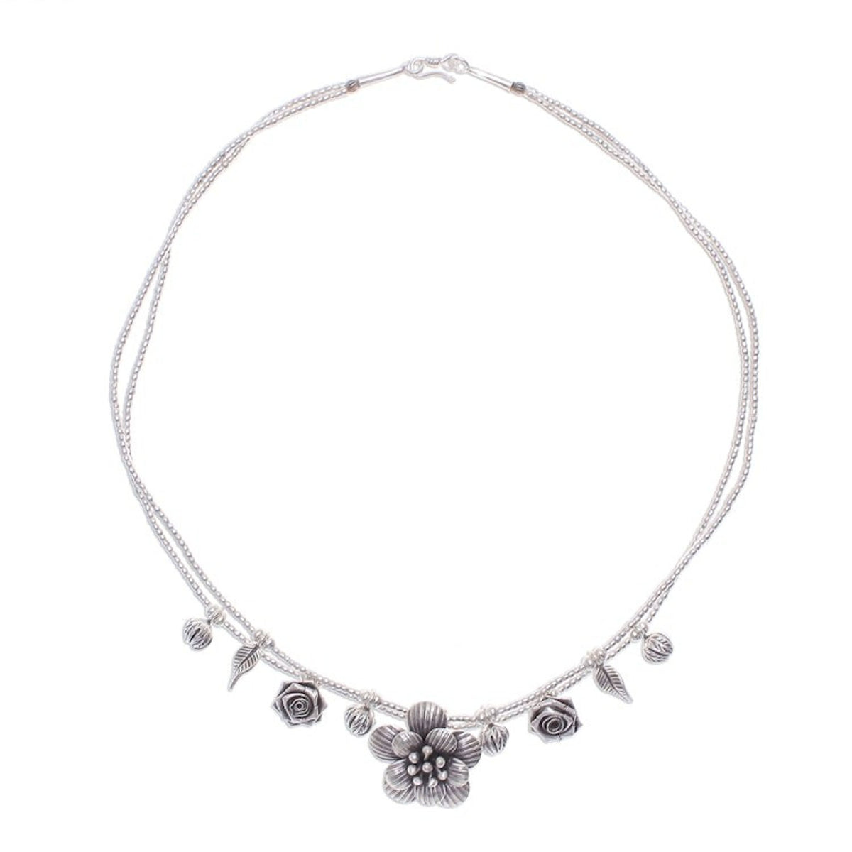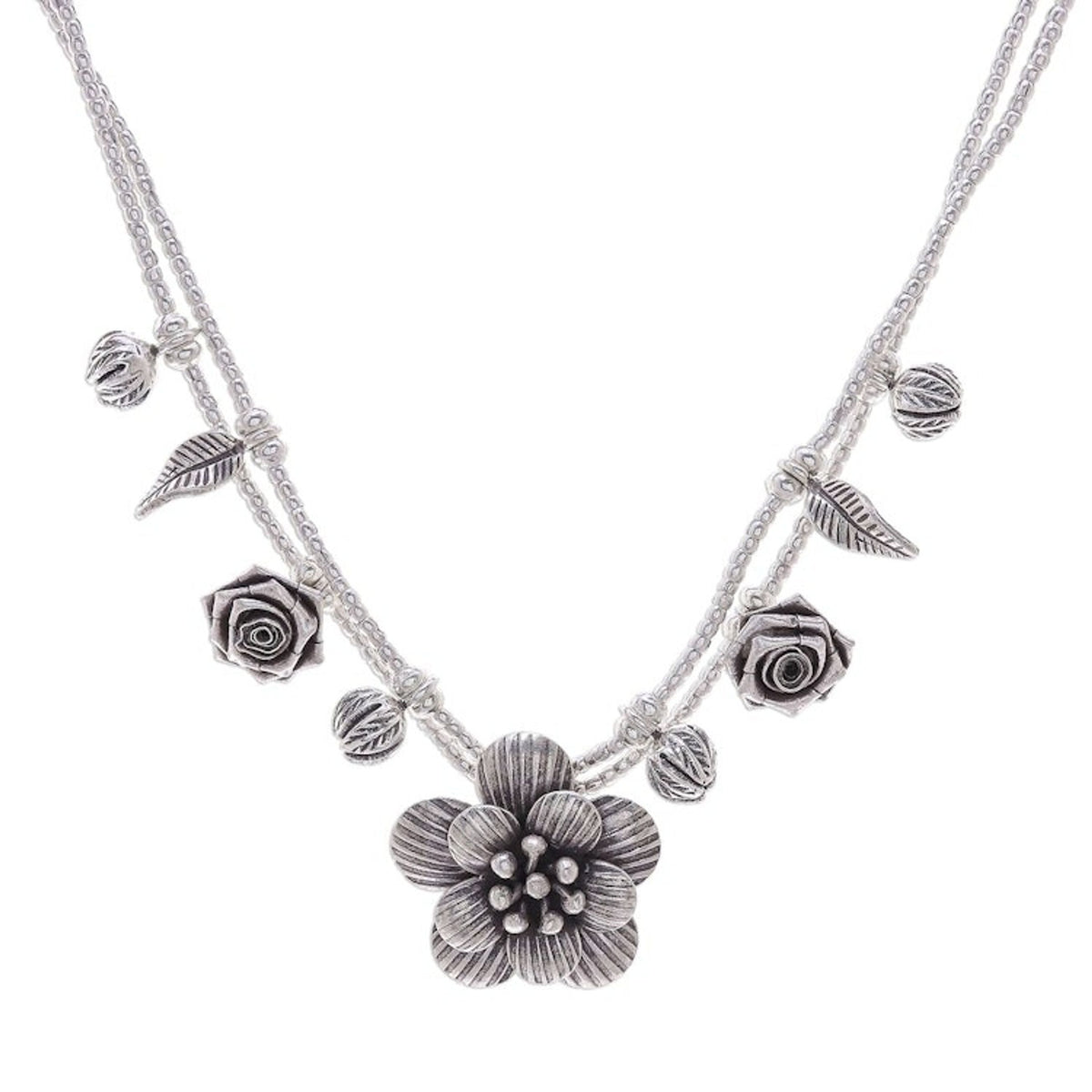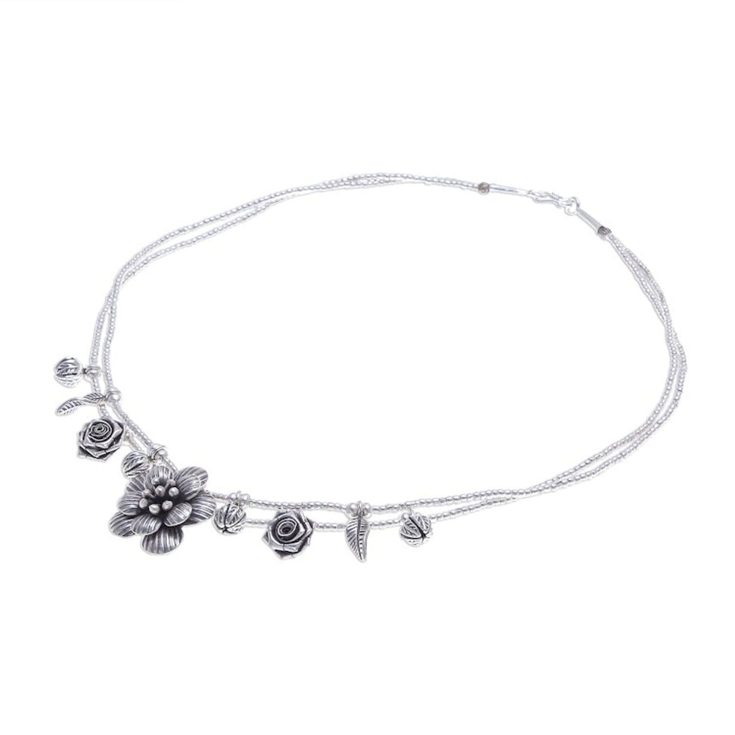This 'Seeds of Love' Silver Flower Two Strand Charm Necklace by Independent Artisans is a graceful and intricate piece that showcases the traditional Karen Hill Tribe silversmithing techniques. Two strands of .950 silver beads are dotted with small charms—leaves, roses, and flower buds—that lead to an oxidized, handmade flower pendant. This necklace is a celebration of artistry and the idea that beautiful things, like seeds of love, blossom from small beginnings. It's a charming and meaningful accessory for daily wear.