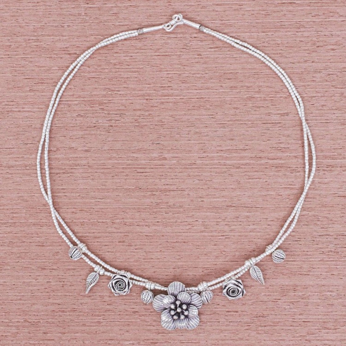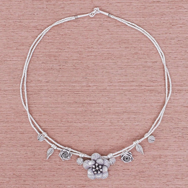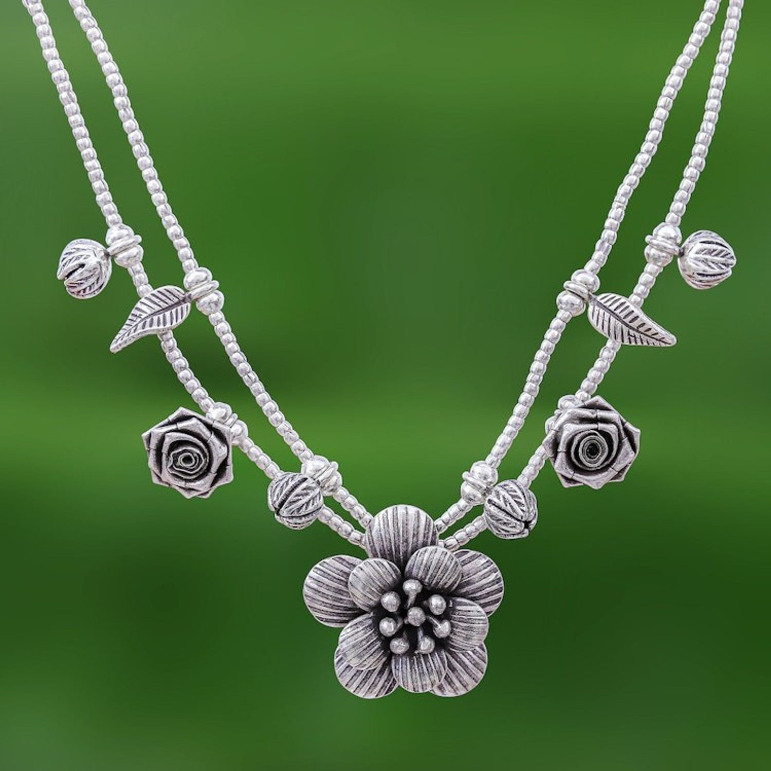 This 'Seeds of Love' Silver Flower Two Strand Charm Necklace by Independent Artisans is a graceful and intricate piece that showcases the traditional Karen Hill Tribe silversmithing techniques. Two strands of .950 silver beads are dotted with small charms—leaves, roses, and flower buds—that lead to an oxidized, handmade flower pendant. This necklace is a celebration of artistry and the idea that beautiful things, like seeds of love, blossom from small beginnings. It's a charming and meaningful accessory for daily wear.