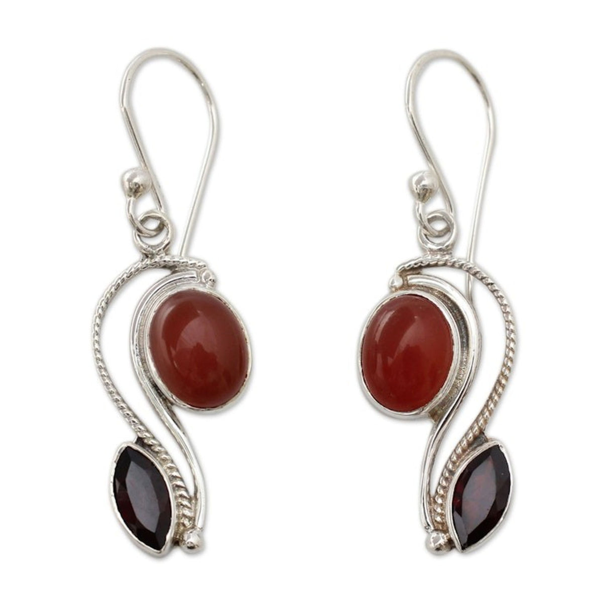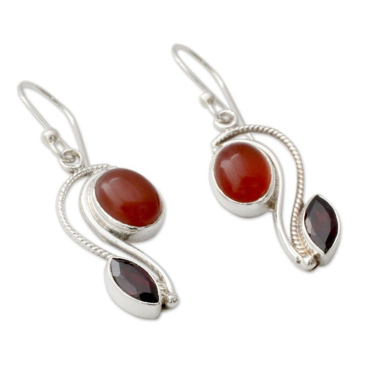 Silver Handcrafted Carnelian and Garnet Earrings from India 'Colorful Curves'