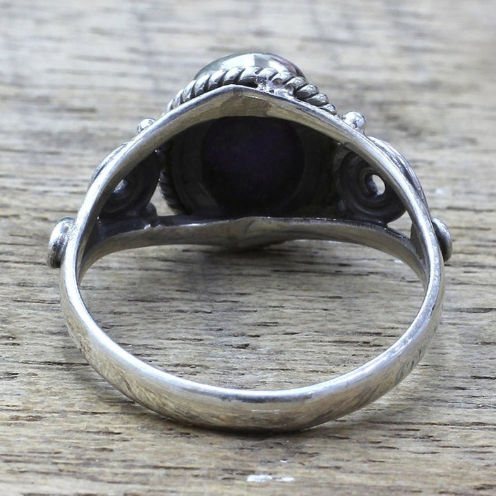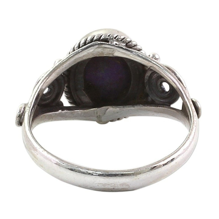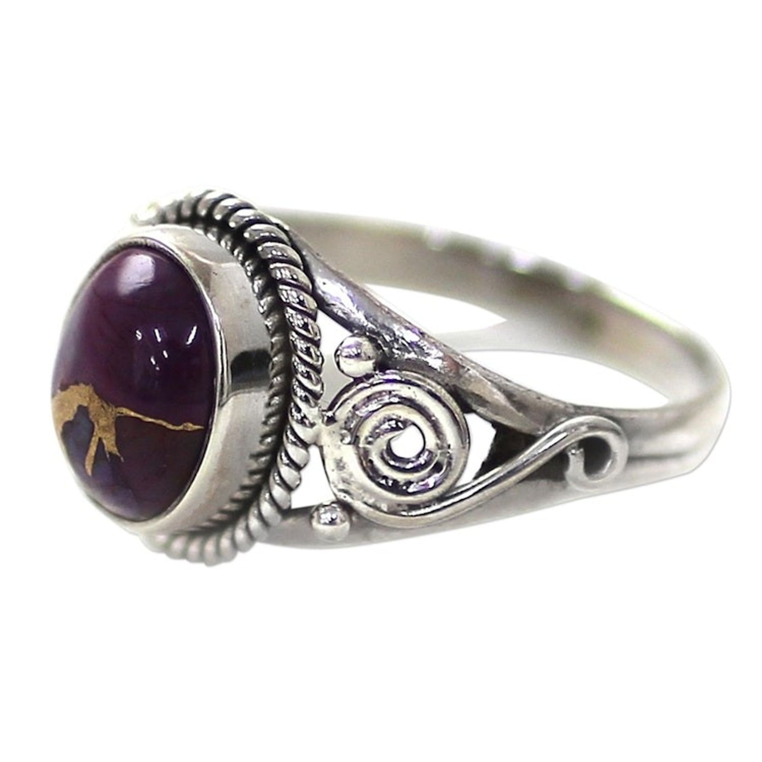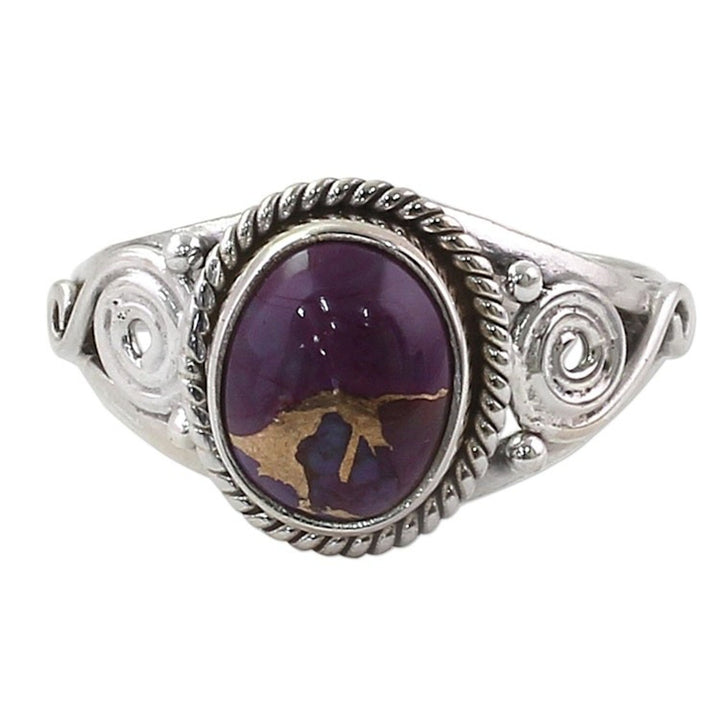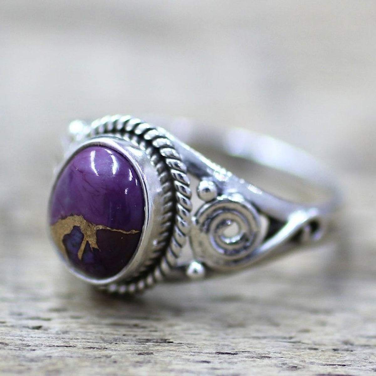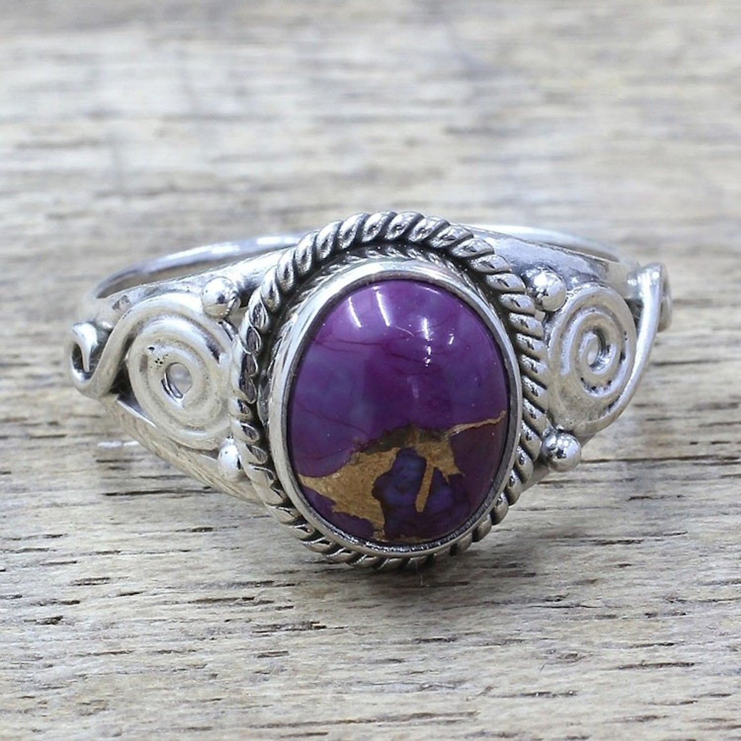 This 'Purple Attunement' Silver Purple Composite Turquoise Cocktail Ring by Independent Artisans is a beautiful cocktail ring designed to attune its wearer with the wisdom of the universe. A single stone of purple composite turquoise rests atop a sterling silver band adorned with intricate rope and swirl motifs. This piece is a perfect fusion of traditional Indian artistry and a modern, bold design, making it a captivating accessory for any occasion. Color(s) may vary slightly.