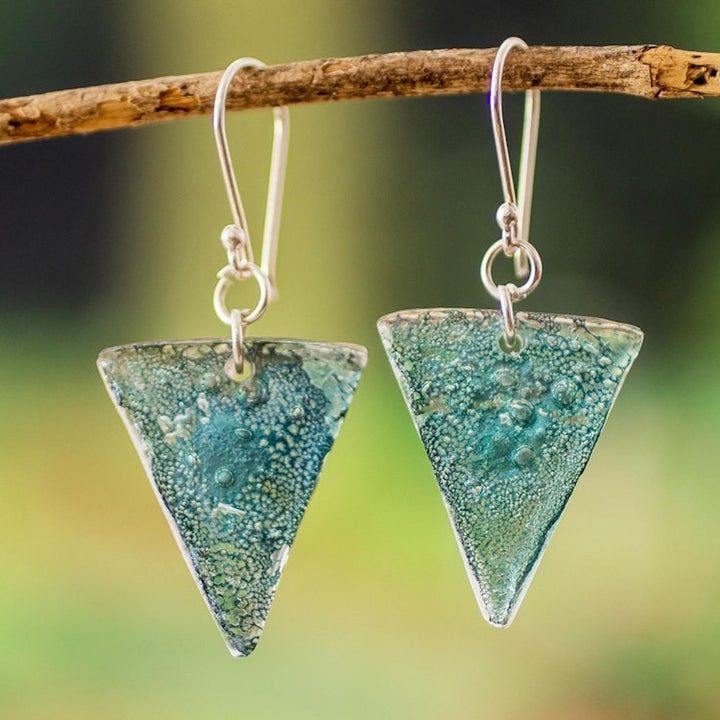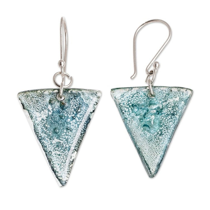 These 'Refined Triangles' Silver Triangular Recycled CD Dangle Earrings by Independent Artisans are a magnificent pair of dangle earrings crafted from recycled CDs. These eco-friendly earrings are a statement of sustainability and creativity. The recycled material is formed into triangular shapes with awe-inspiring designs in silver hues. They dangle gracefully from sterling silver hooks. The color and pattern of the recycled material may vary slightly, making each pair unique.