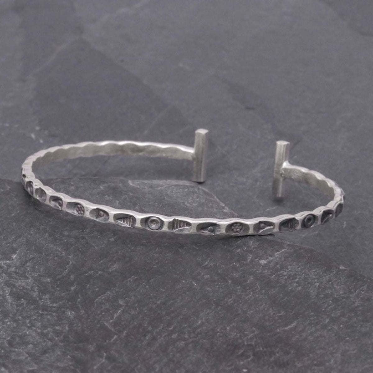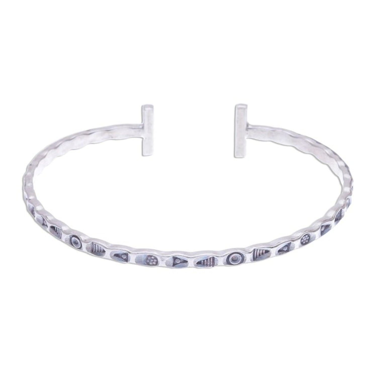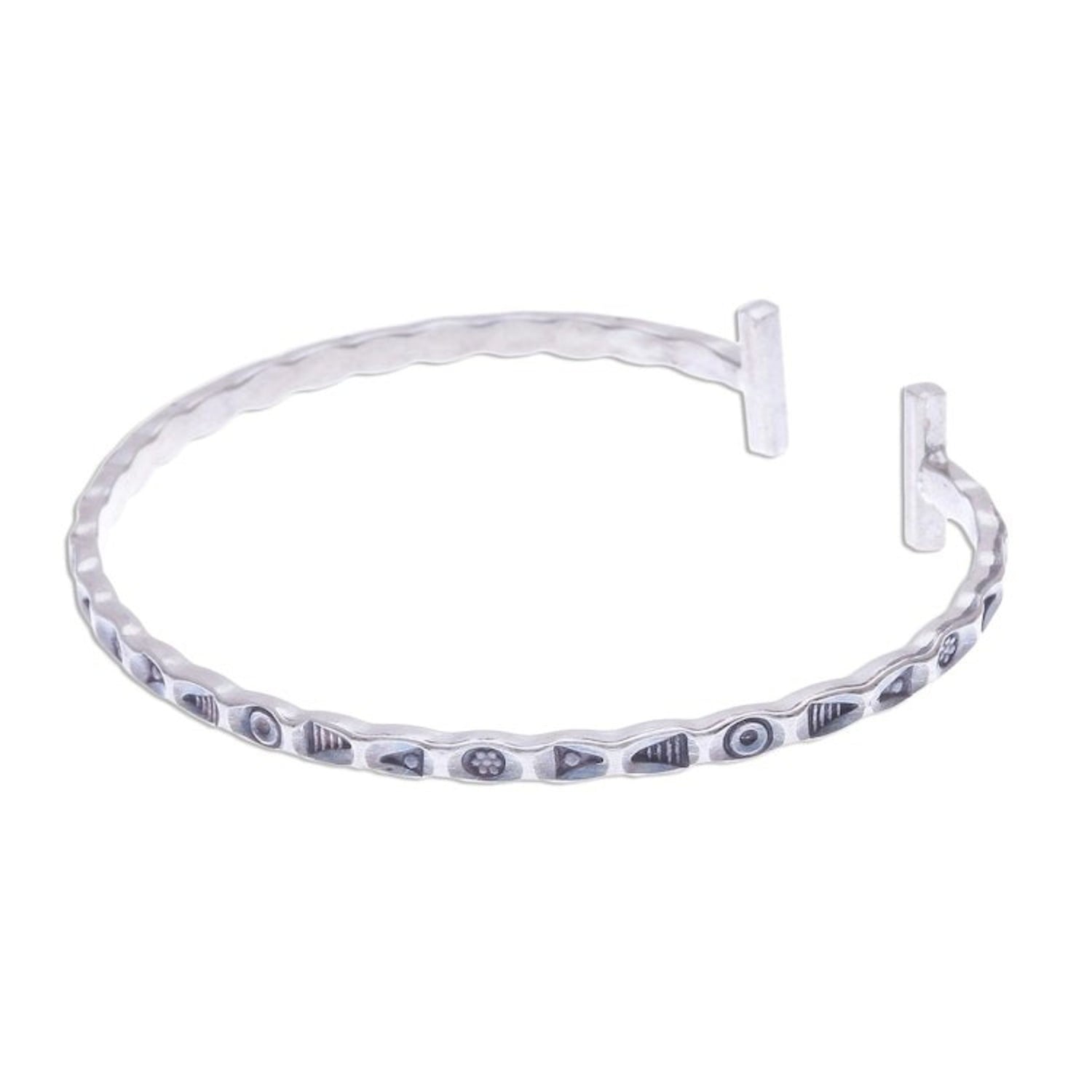 This 'Karen Flavor' Slender Stamped Sterling Silver Cuff Bracelet by Independent Artisans is a slender cuff bracelet that is rich in cultural heritage. Traditional Karen Hill Tribe motifs are stamped along its length. The cuff culminates in perpendicular bars at both ends, adding a subtle, modern touch. This sterling silver piece is a beautiful blend of traditional artistry and contemporary design.