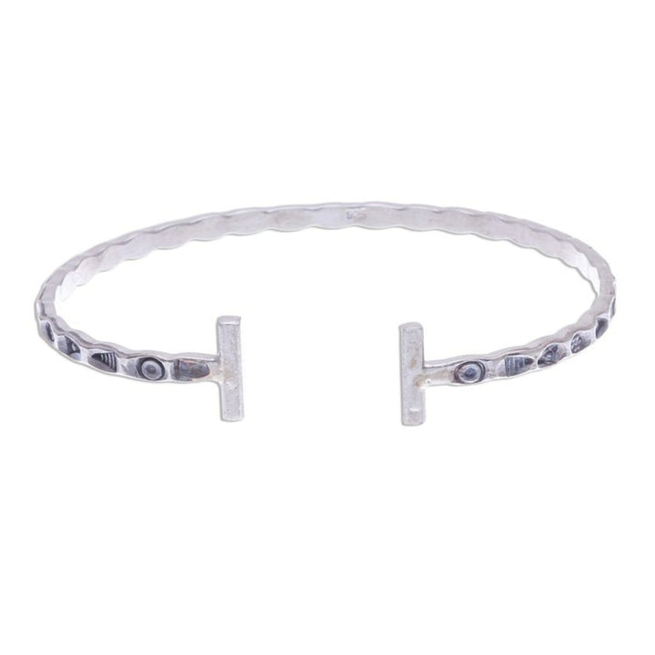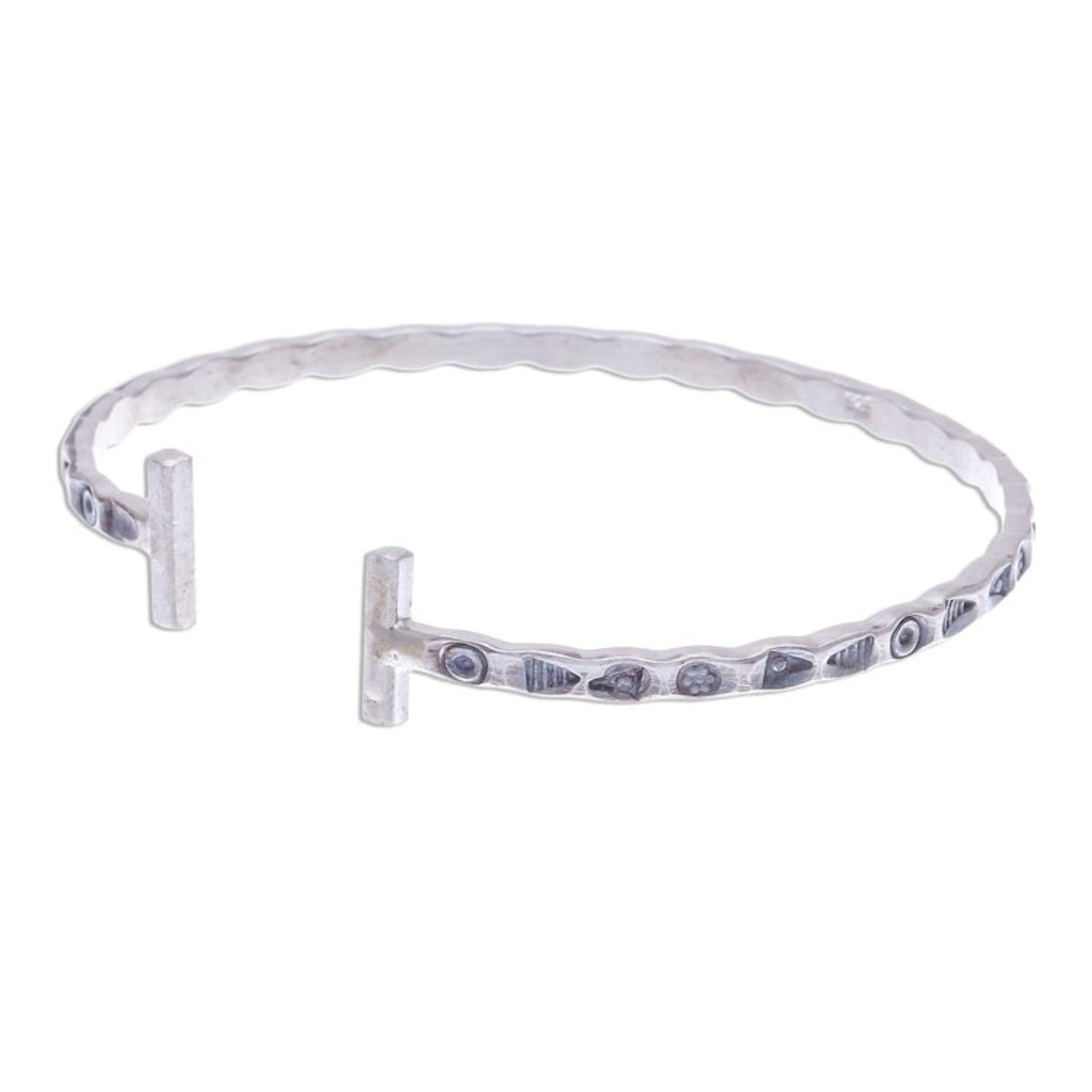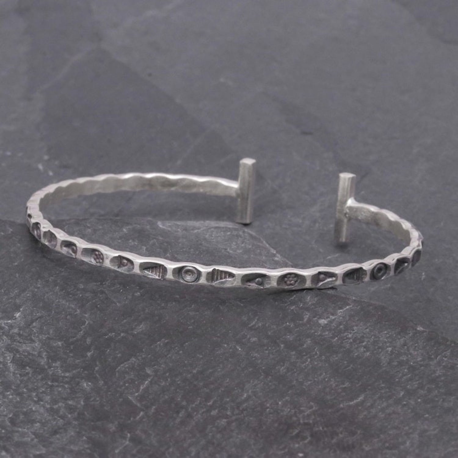 This 'Karen Flavor' Slender Stamped Sterling Silver Cuff Bracelet by Independent Artisans is a slender cuff bracelet that is rich in cultural heritage. Traditional Karen Hill Tribe motifs are stamped along its length. The cuff culminates in perpendicular bars at both ends, adding a subtle, modern touch. This sterling silver piece is a beautiful blend of traditional artistry and contemporary design.