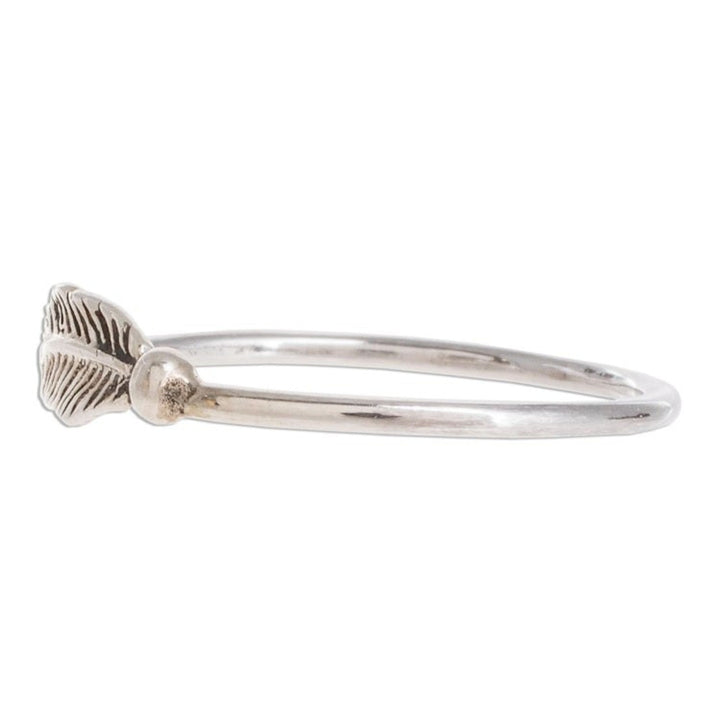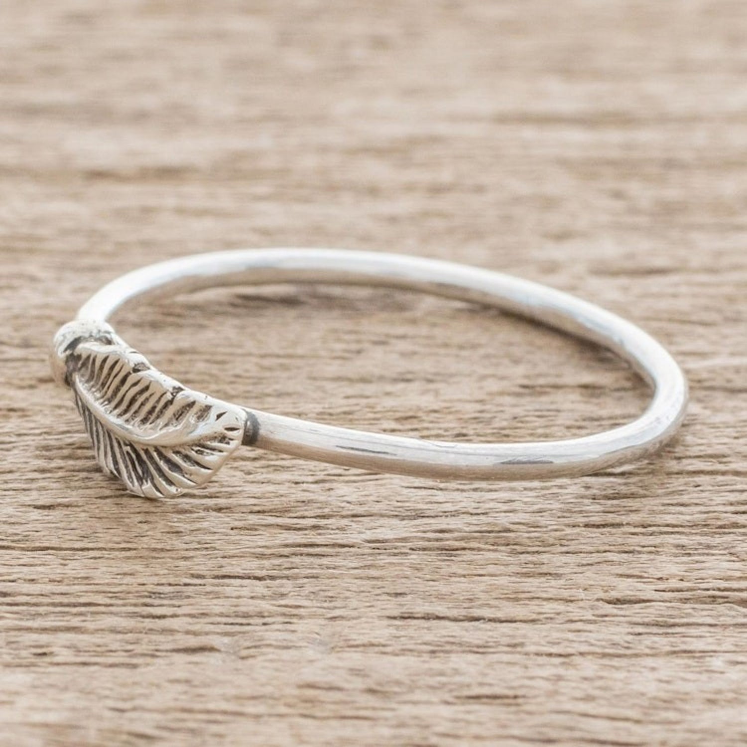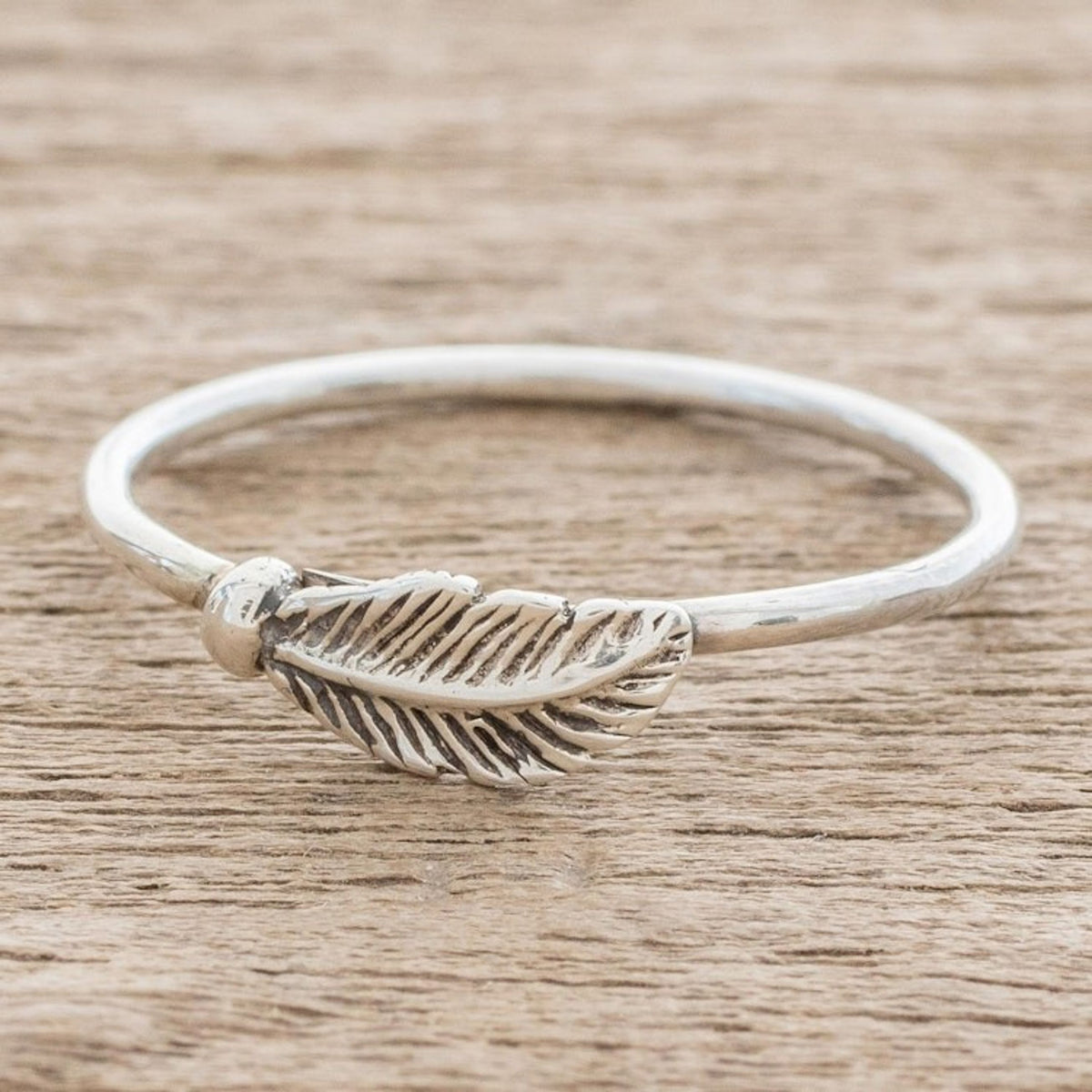 This 'Fallen Feather' Slender Sterling Silver Band Ring with Feather by Independent Artisans is a delicate and simple band ring. The rounded sterling silver band is crowned with a realistic feather, which has subtle oxidization to enhance its detail. The ring's appealing simplicity and beautiful craftsmanship make it a perfect accessory for everyday wear.