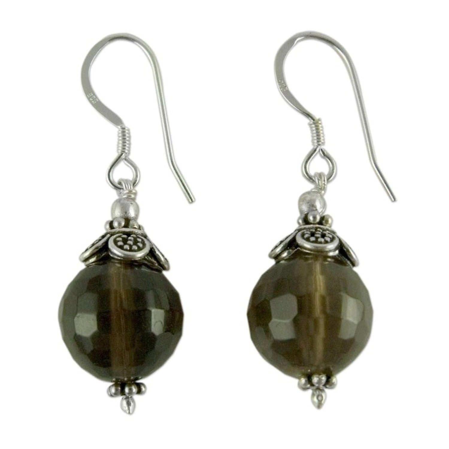 These 'Jaipur Sonnet' Smoky Quartz Dangle Earrings by Independent Artisans captivate with Indian elegance. Nestled within ornate sterling silver settings, these earrings highlight the natural glow of smoky quartz. The faceted gems, totaling 20 carats, are said to be connected with the sounds of the universe, fostering perception and learning. The combination finish adds a rich texture to the design.