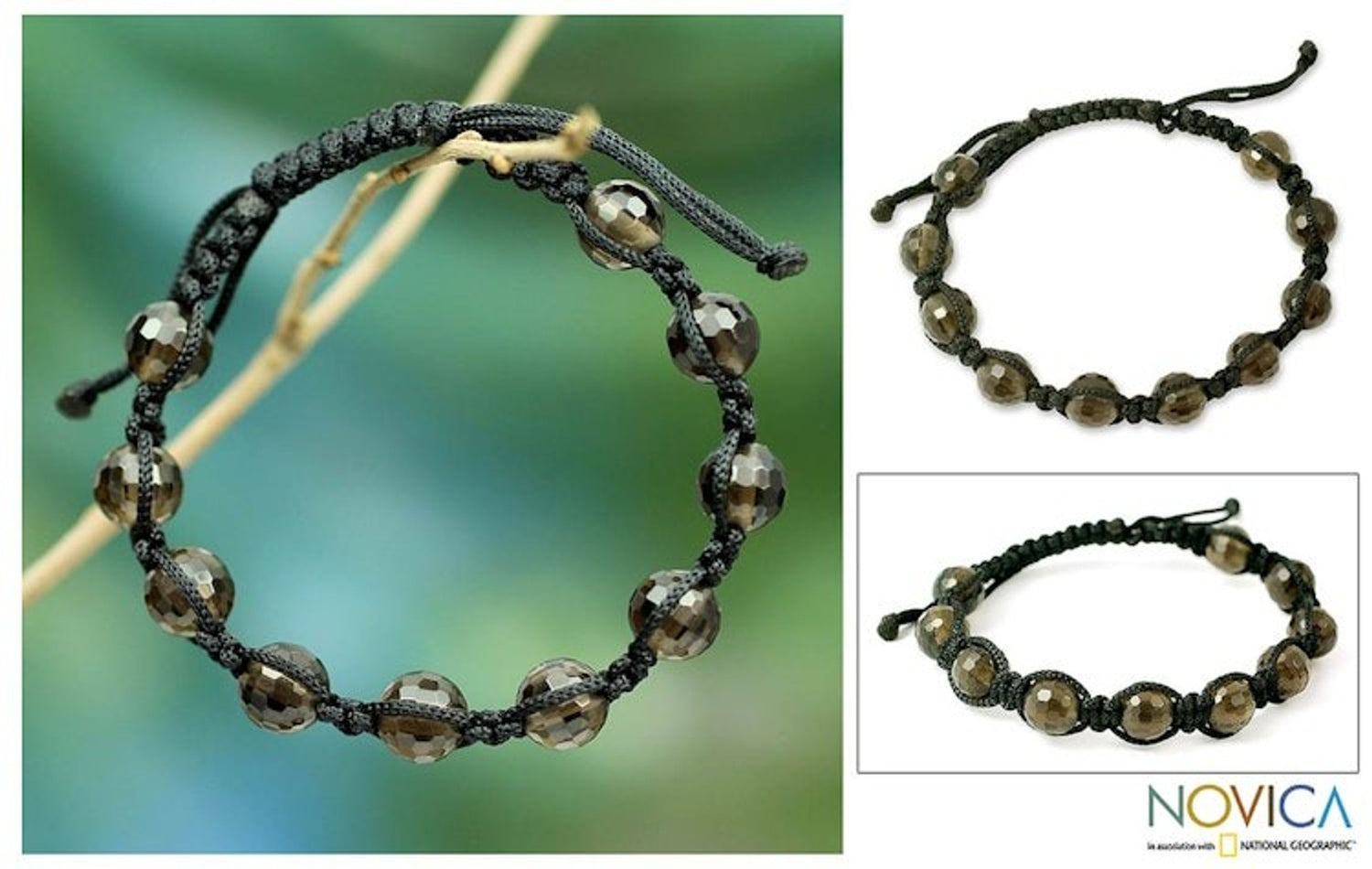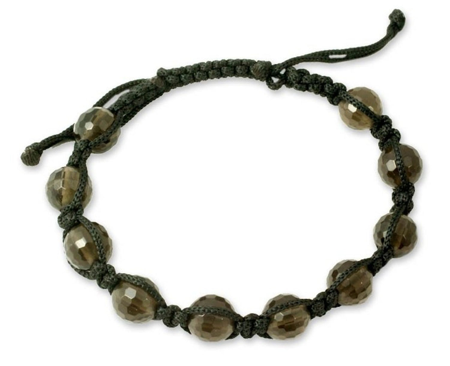 Handcrafted in India, this bracelet is made from smoky quartz on nylon threads. The total weight is 0.28 oz. It is adjustable from 5 to 8.8 inches L x 0.4 inches W.