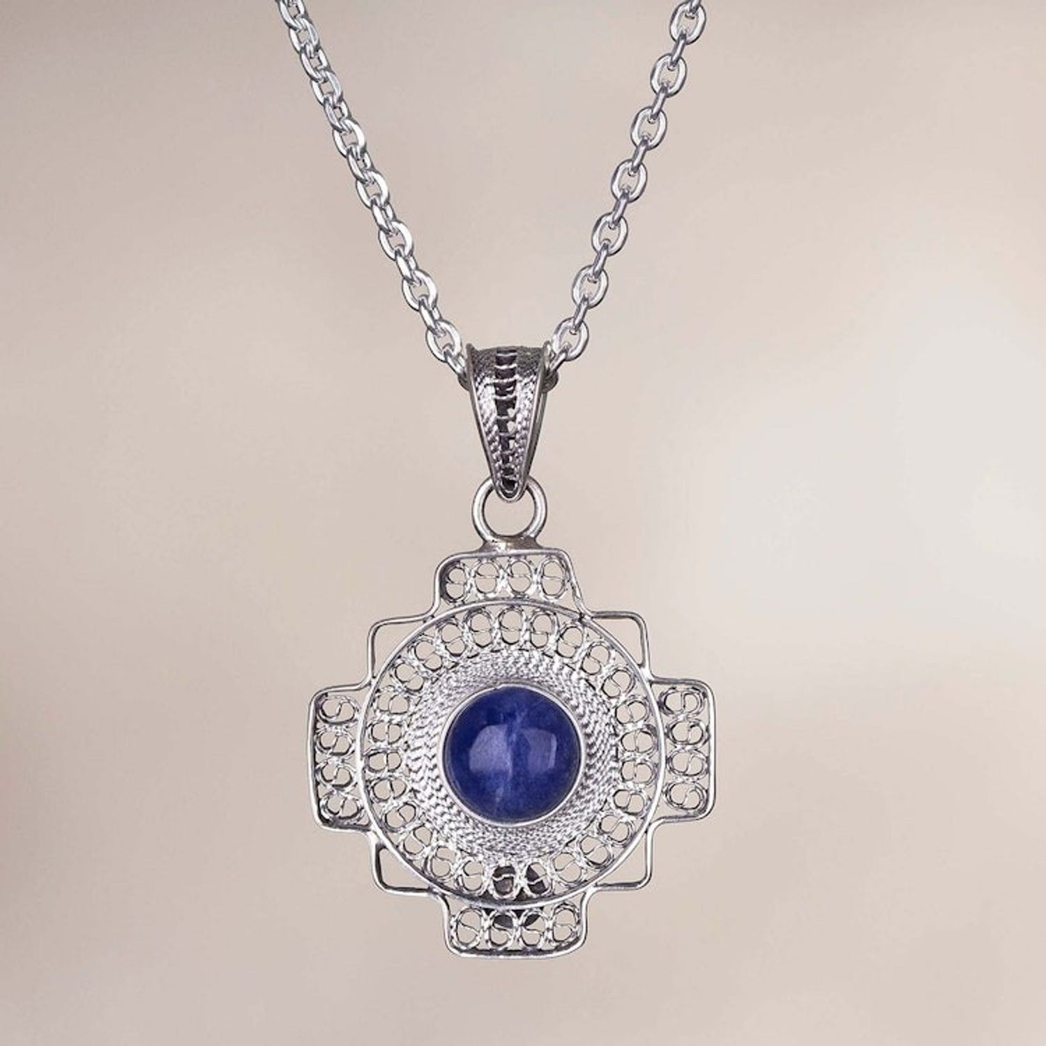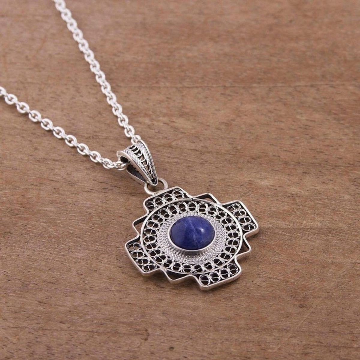 This 'Blue Mountain Chakana' Sodalite Chakana Cross Filigree Pendant Necklace by Independent Artisans pays homage to the chakana cross. It is handcrafted with intricate sterling silver filigree. The cross is set with a round stone of natural sodalite in the center, evoking the blue skies above the Andes. This pendant necklace is a beautiful piece that symbolizes the union of the spiritual and mortal worlds. The natural stone may have variations in color and/or pattern.