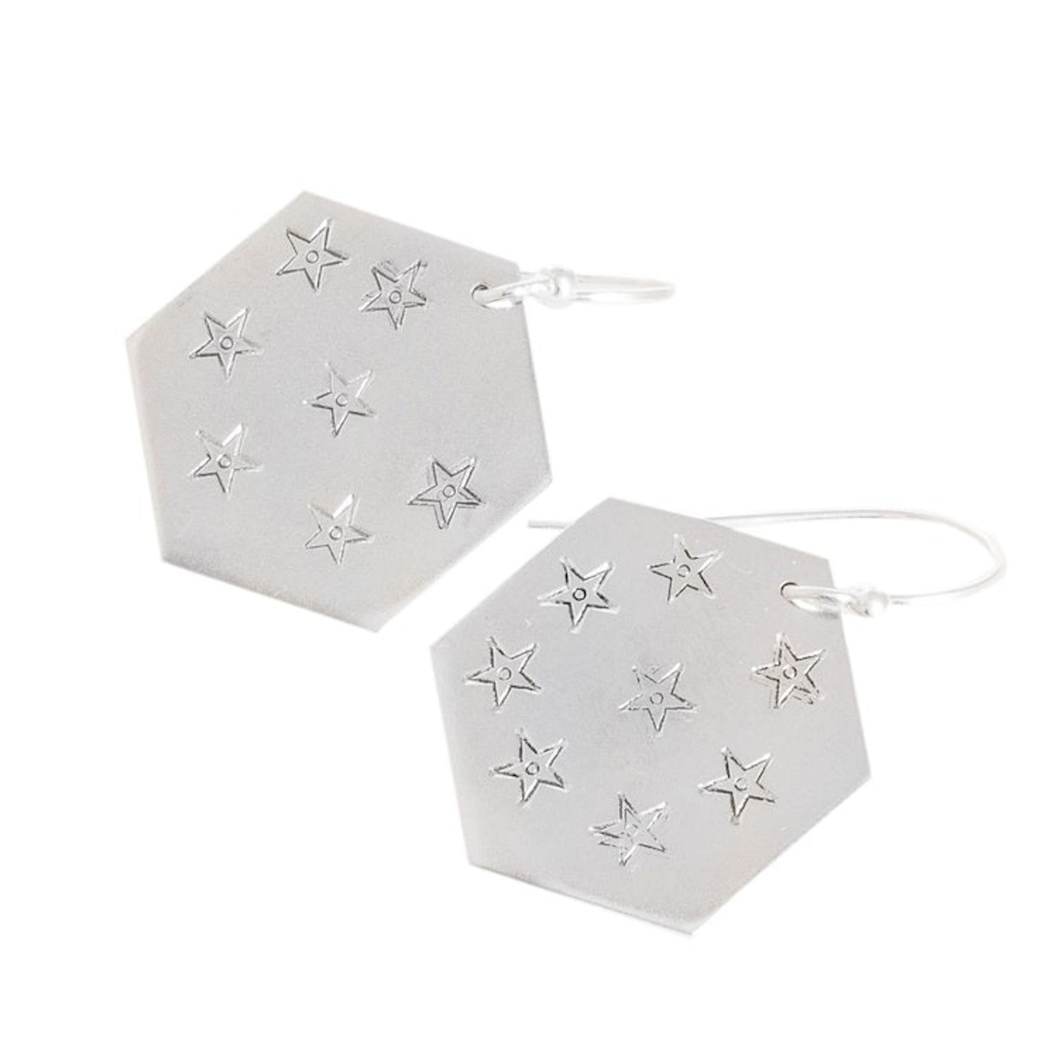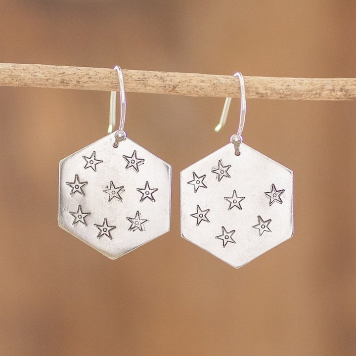 These 'Hexagon of Stars' Star and Geometric Themed Sterling Silver Dangle Earrings by Independent Artisans are a contemporary and fashionable pair of dangle earrings. The hexagon-shaped earrings feature star motifs, perfect for those who love to make a statement. The high polish finish adds to their sleek and stylish vibe.