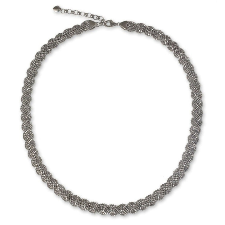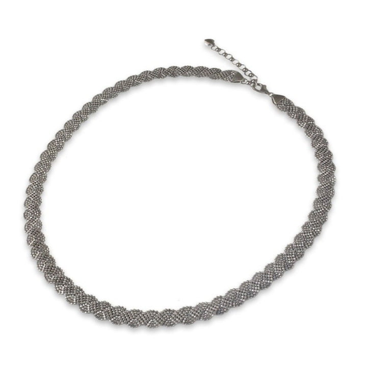 This 'Serpentine Chic' Sterling Silver 925 Necklace with Serpentine Curved Design by Independent Artisans features elegant serpentine curves crafted of beaded chain that form a graceful scalloped collar. The necklace is made from sterling silver with a high polish finish and has an extender for a perfect fit.