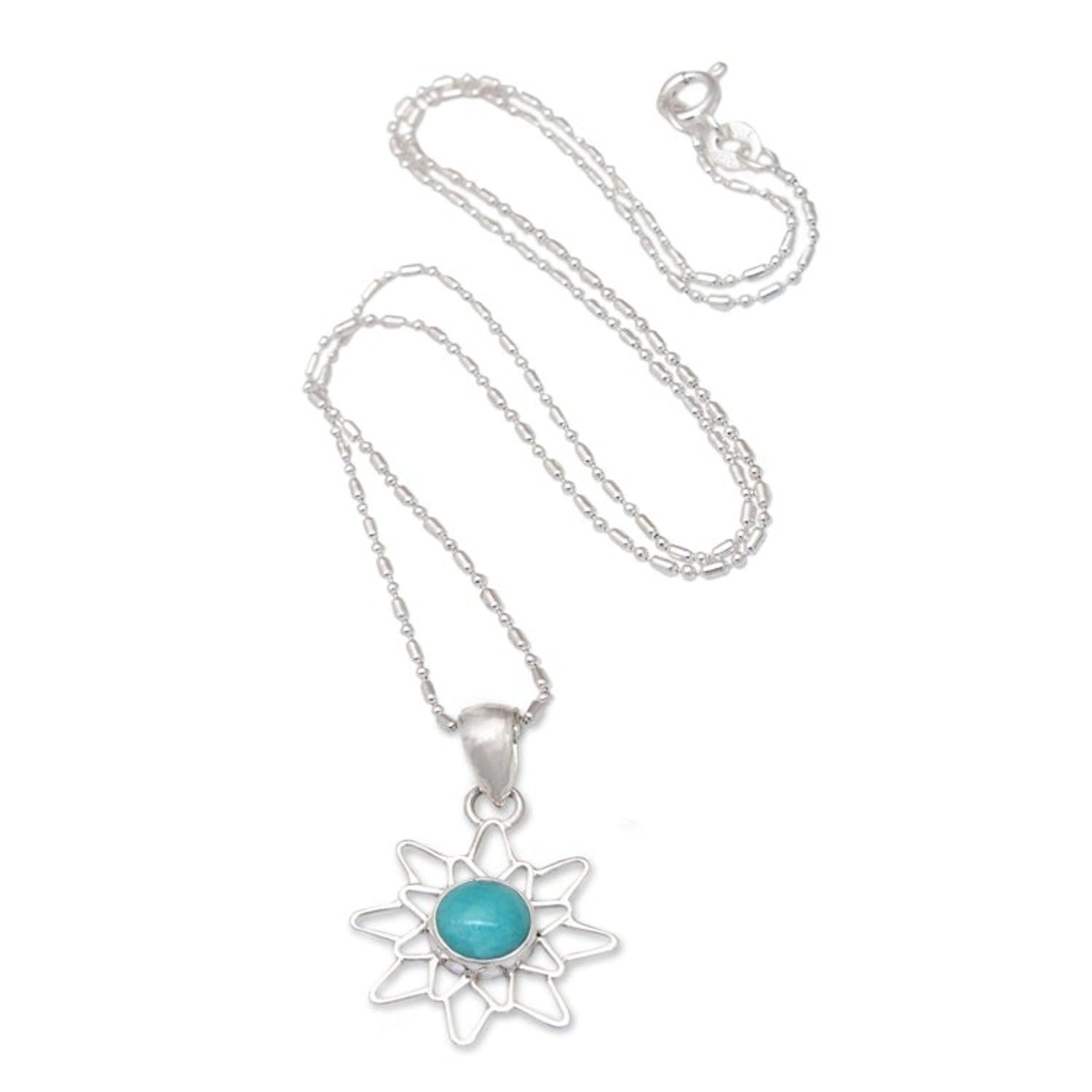 This 'Chakra Splendor' Sterling Silver Amazonite Chakra Flower Pendant Necklace by Independent Artisans is an exquisite pendant necklace. A mesmerizing chakra flower with a stunning amazonite stone at its core adorns the piece. This breathtaking sterling silver accessory showcases an intricate bar link chain and is elegantly polished, infusing the necklace with glamor and sophistication. The color may vary slightly.