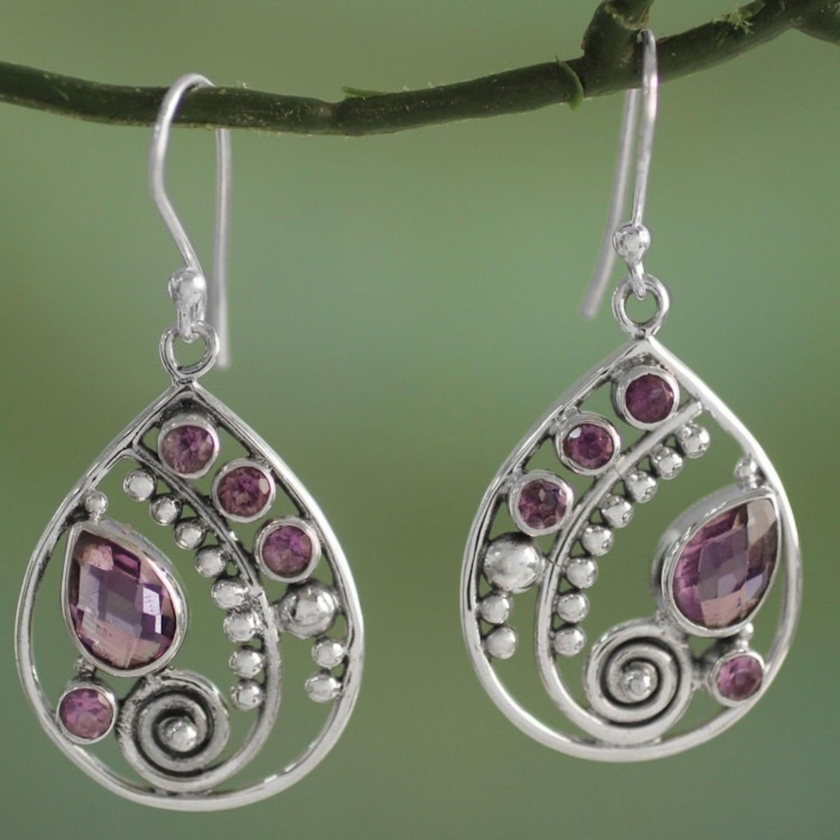 These 'Lilac Radiance' Sterling Silver Amethyst Dangle Earrings from India by Independent Artisans mimic radiant stalks of grass glistening with dew. Handcrafted from sterling silver and tear-drop amethyst stones, the earrings are framed by silver tendrils with a slightly darker finish. Three carats of amethyst shine brightly, lending this pair a complexity that is sure to be noticed.