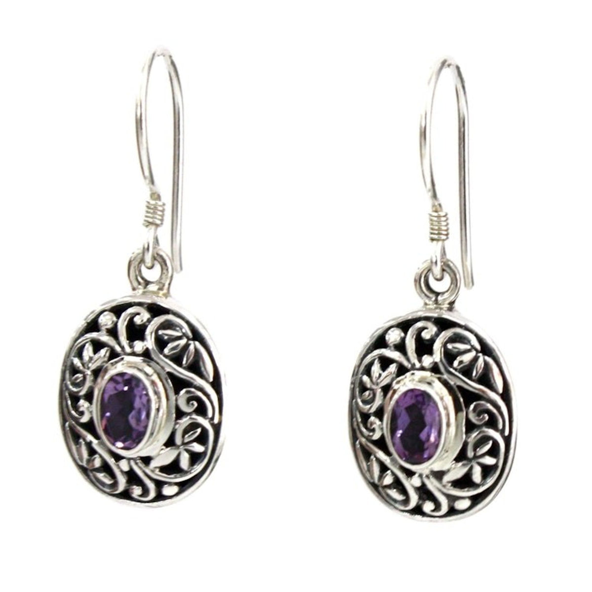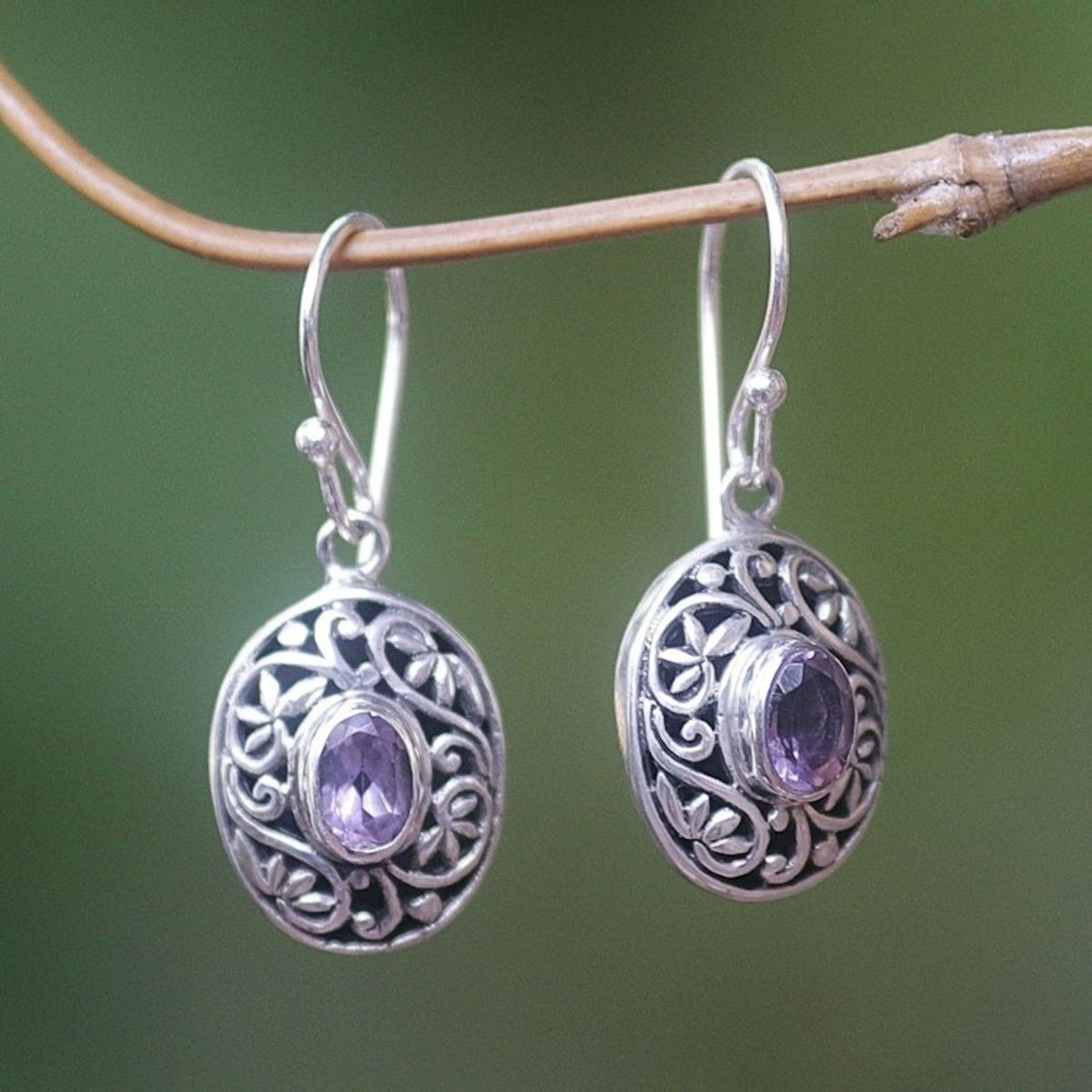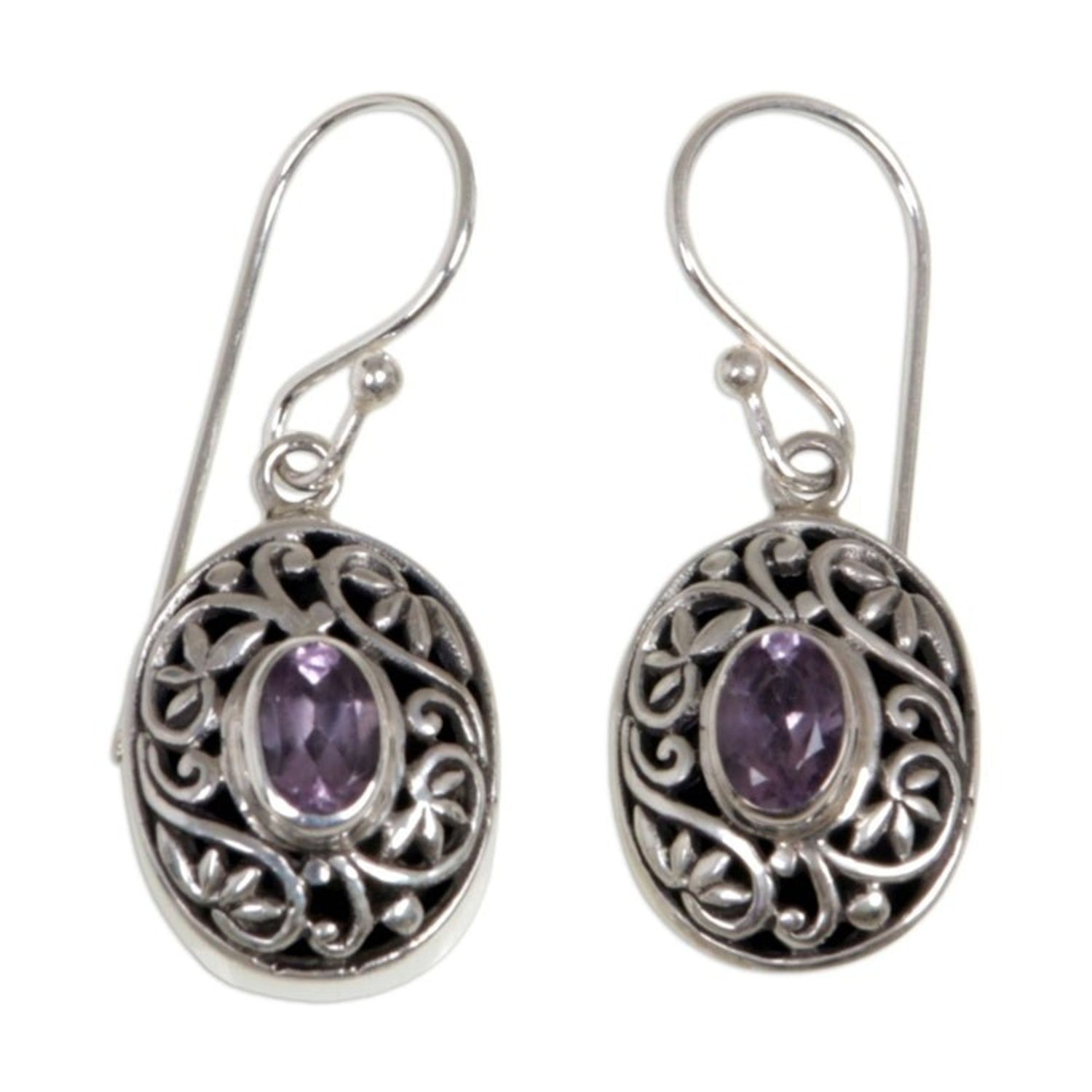 Handcrafted in Indonesia, these hook earrings are made from sterling silver and amethyst with a combination finish. The total weight is 0.18 oz. Each earring measures 1.4 inches L x 0.5 inches W.