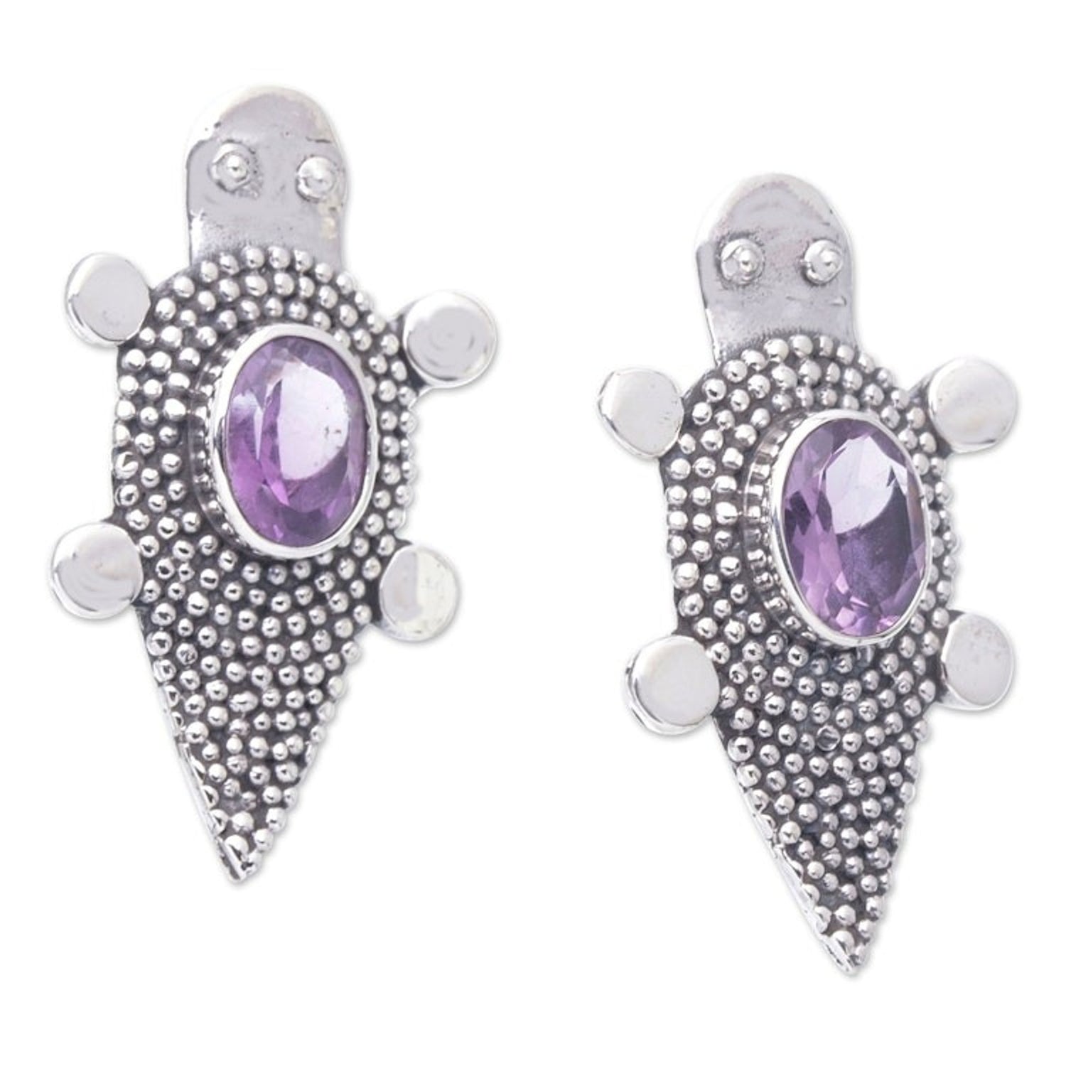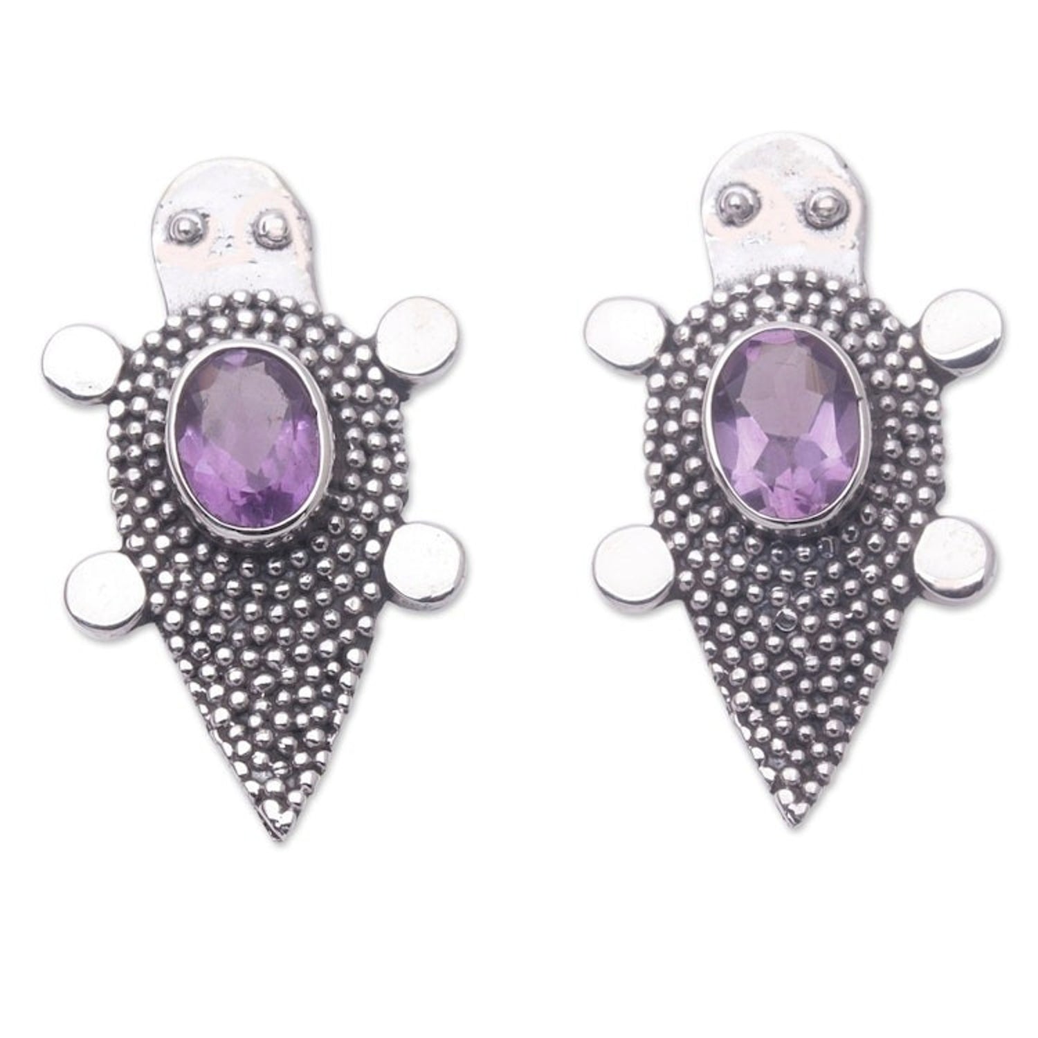 These 'Heaven's Purple Tortoise' Sterling Silver Amethyst Tortoise Button Earrings by Independent Artisans draw inspiration from tortoises, which are symbols of wisdom and knowledge. The sterling silver button earrings feature little shells full of dots. The accessory has faceted amethyst stones totaling over one carat, bringing a bewitching look to the item. The color may vary slightly.