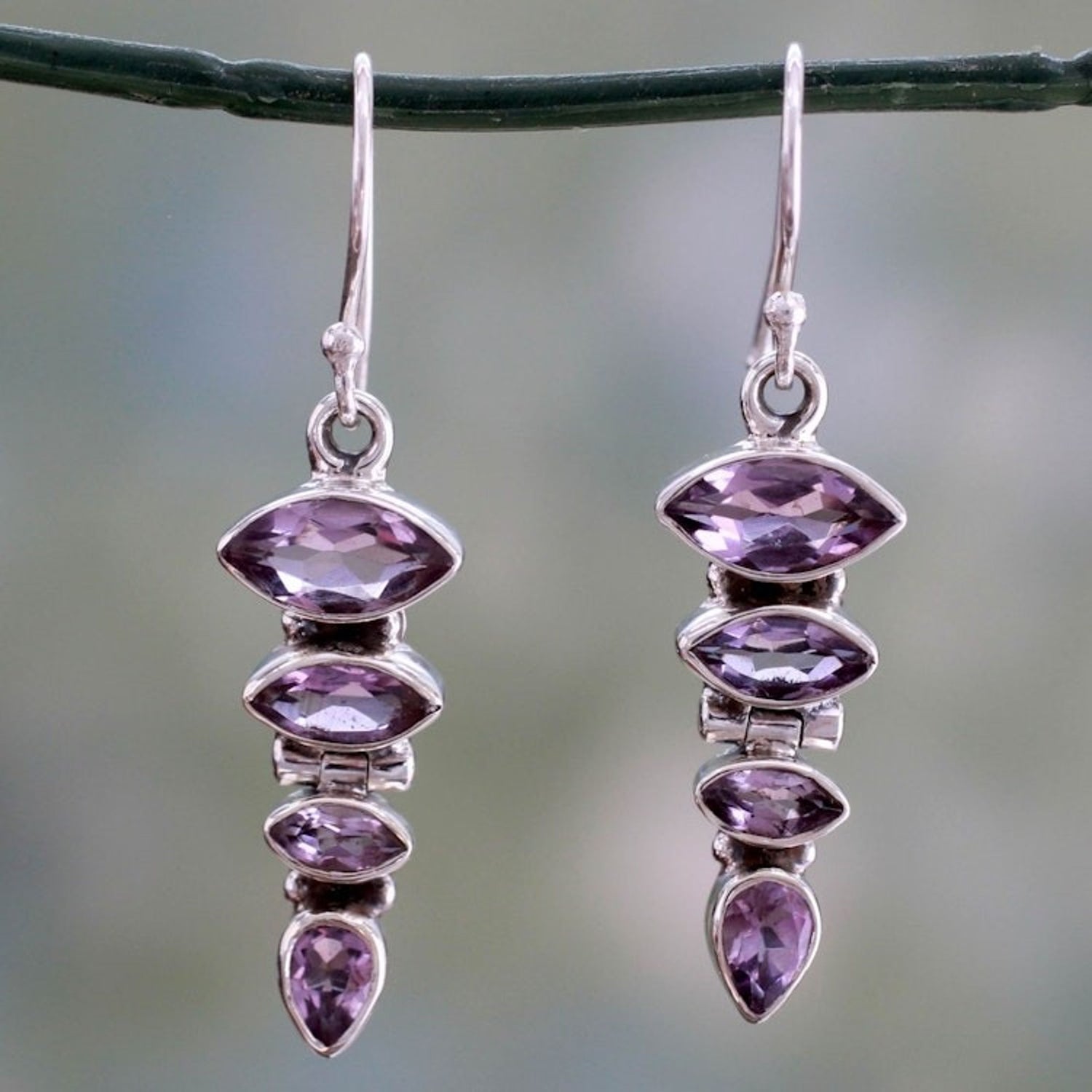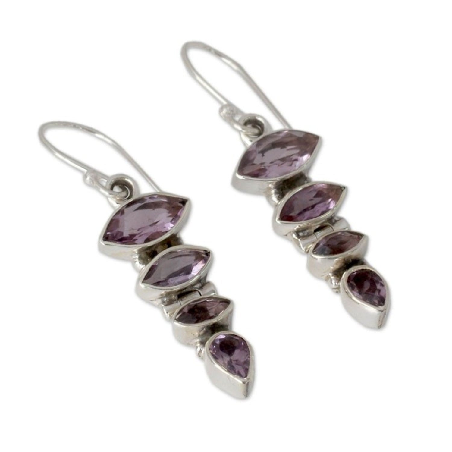 These 'Mystical Quartet' Sterling Silver and Amethyst Dangle Earrings from India by Independent Artisans feature amethysts that align in dazzling tiers. Three marquise-cut gemstones rest atop a pear-shaped amethyst, all set in gleaming sterling silver. The amethyst gems total over 4 carats and have a high polish finish.